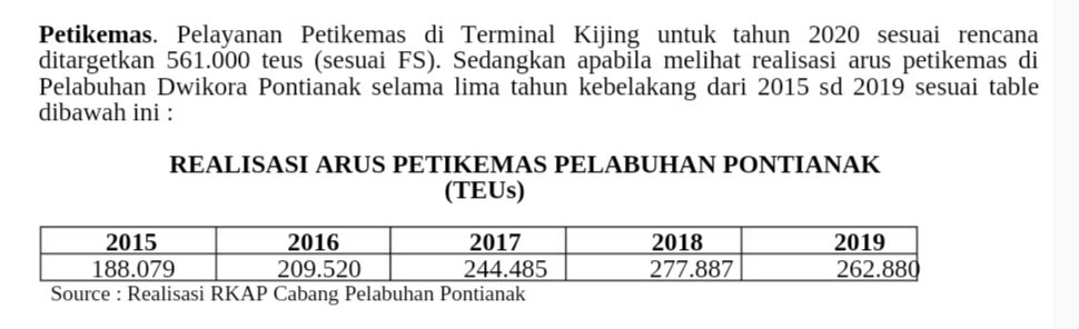 Petikemas. Pelayanan Petikemas di Terminal Kijing untuk tahun 2020 sesuai rencana ditargetkan 561.000 teus. Sedangkan apabila melihat realisasi arus petikemas di Pelabuhan Dwikora Pontianak selama lima tahun kebelakang dari 2015 sd 2019.