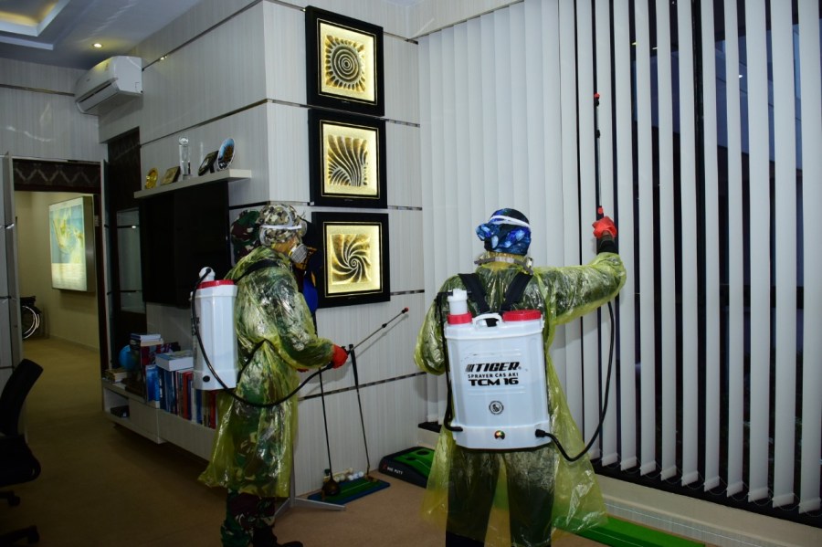 Satuan Kesehatan (Satkes) Pushidrosal melakukan penyemprotan cairan desinfektan di seluruh area kantor Mako Pushidrosal, Minggu (22/3/2020).
