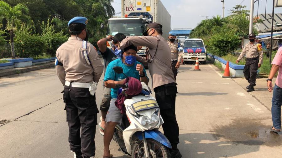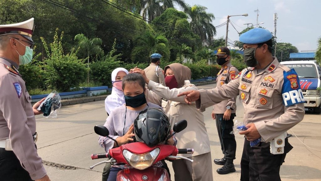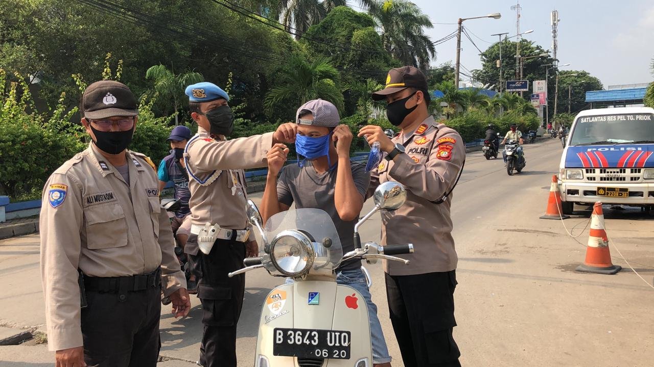 Salah satu upaya mencegah penyebaran Covid-19, Polres Pelabuhan Tanjung Priok melalui Polsek Kawasan Muara Baru bagikan masker di Jalan Hiu Raya, Kawasan Muara Baru Jakarta Utara, Rabu (15/04/2020).Kegiatan ini, Kapolsek Kawasan Muara Baru AKP. Slamet Riyanto bersama anggotanya membagi-bagikan masker secara gratis kepada para pengendara mobil dan motor yang tidak memakai masker yang melintas di Jalan Hiu Raya Muara Baru.