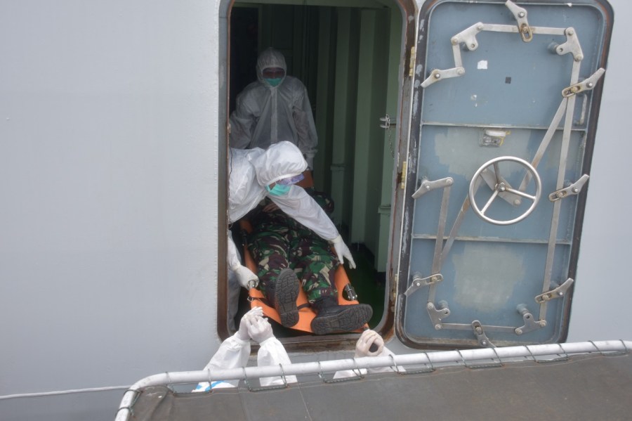 “Hal ini bertujuan untuk melatih para peserta tentang SOP pelaksanaan evakuasi pasien yang sedang berada di atas kapal. Dengan posisi di laut yang telah terpapar dengan gejala mirip infeksi Virus Corona,”ujar Pangkolinlamil.(Ody – Dispen Kolinlamil)