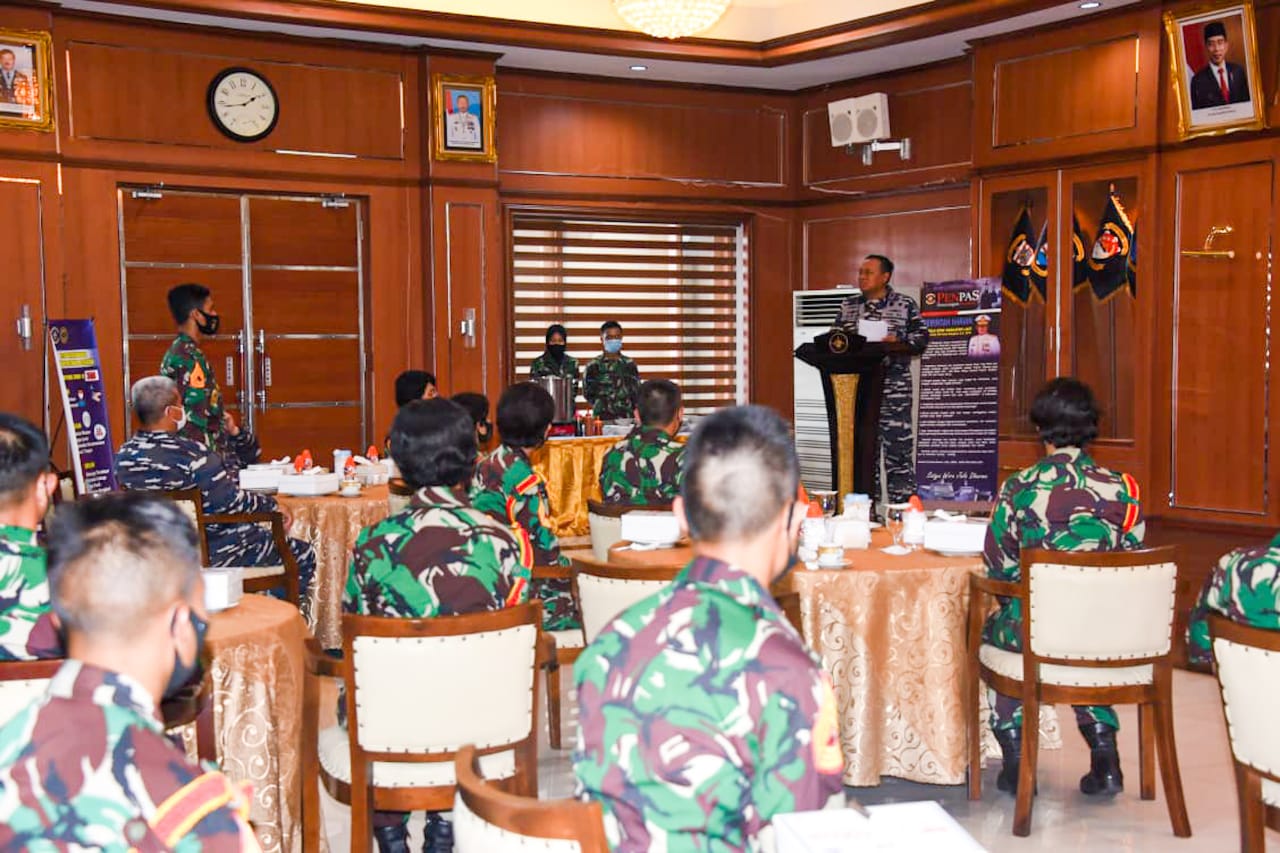 Panglima Komando Lintas Laut Militer (Kolinlamil) Laksda TNI Irwan Achmadi, M.Tr (Han) menerima kunjungan 34 Taruna dan 11 Taruni Akademi Angkatan Laut (AAL) angkatan 66 di Mako Kolinlamil, Tanjung Priok, Jakarta Utara, Senin (9/11/2020).Panglima Kolinlamil yang baru tiba usai mengomando Latihan Operasi Pendaratan Administrasi (Latopsratmin) di Lampung, menerima sebagian para taruna-taruni AAL yang mengikuti latihan pendaratan administrasi yang juga sebagai bagian materi dari Latihan Jala Yudha 2020.
