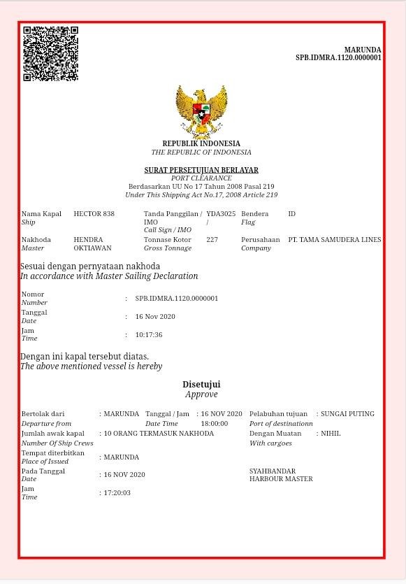 “SPB On line perdana tersebut diserahkan kepada agen Pelayaran PT. Tama Samudra Line untuk kapal TB. Hector 838 dan TK. PBM 838. Hal ini, merupakan wujud nyata dari semangat KSOP Kelas IV Marunda untuk memenuhi pelayanan berintegritas dan berorientasi digital agar tercipta pelayanan yang lebih efisien, bersih, cepat dan tepat bagi para pengguna jasa pelayaran,” terang Iwan.