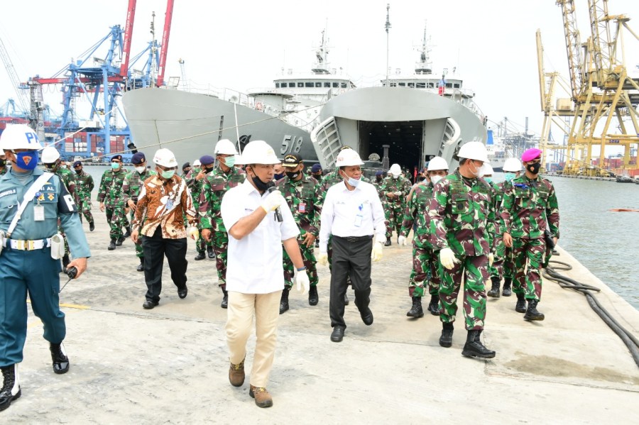 Satya Wira Jala Dharma. 2 Kapal perang baru TNI AL yang akan diresmikan sandar di Dermaga Kolinlamil, Tanjung Priok, Jakarta Utara, hari ini Kamis (26/11/2020). Kepala Staf Angkatan Laut Laksamana TNI Yudo Margono, S.E., M.M. didampingi Panglima Komando Lintas Laut Militer (Kolinlamil) Laksda TNI Irwan Achmadi, M.Tr (Han) melakukan peninjauan terhadap KRI Teluk Kendari 518 dan KRI Teluk Kupang 519 yang nantinya akan memperkuat armada TNI AL.2 kapal perang jenis Angkut Tank (AT) ini hasil karya putra-putra terbaik bangsa yang dikerjakan oleh perusahaan galangan kapal PT Dok & Perkapalan Kodja Bahari (PT DKB). Setelah menerima paparan tentang kesiapan 2 kapal perang baru tersebut dari pihak PT DKB Jakarta, Kasal meninjau KRI Teluk Kendari 518 dan KRI Teluk Kupang sekaligus menyaksikan latihan embarkasi Tank BMP 3 F Batalyon Tank Amfibi 1 Marinir (Yontankfib 1 Mar) di Base Plate Dermaga Kolinlamil.