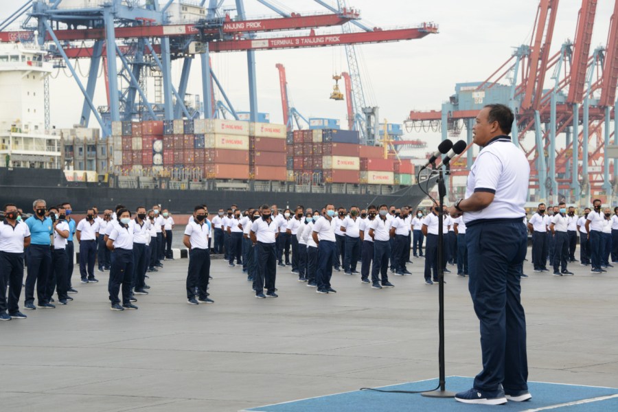 Satya Wira Jala Dharma. Panglima Komando Lintas Laut Militer (Kolinlamil) Laksda TNI Irwan Achmadi, M.Tr (Han) melaksanakan olahraga bersama dengan seluruh prajurit dan PNS jajaran Kolinlamil menjelang serah terima jabatan, di Lapangan Mulyono Silam, Dermaga Kolinlamil – Jakarta Utara, Jumat (27/11/2020).