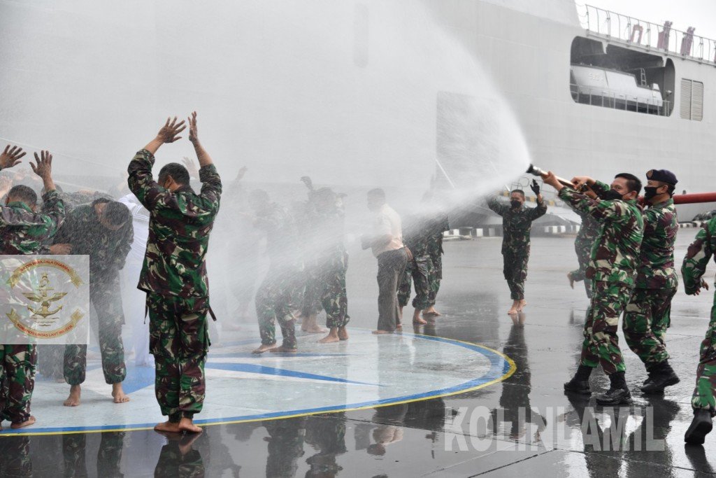 Sesuai dengan tradisi di TNI AL, usai kenaikan pangkat para prajurit baik Perwira, Bintara maupun Tamtama yang naik pangkat disiram dengan air dari mobil pemadam Kebakaran Kolinlamil sebagai bentuk pengabdian prajurit matra laut. (MM – Dispen)