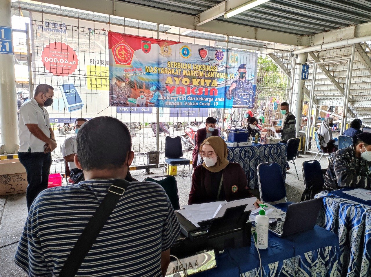 Kegiatan yang mengusung tema “Serbuan Vaksin Masyarakat Maritim TNI AL” ini berlangsung di Terminal DCS Lantai 1, Pelabuhan Makassar, hari ini Rabu (7/7/2021).