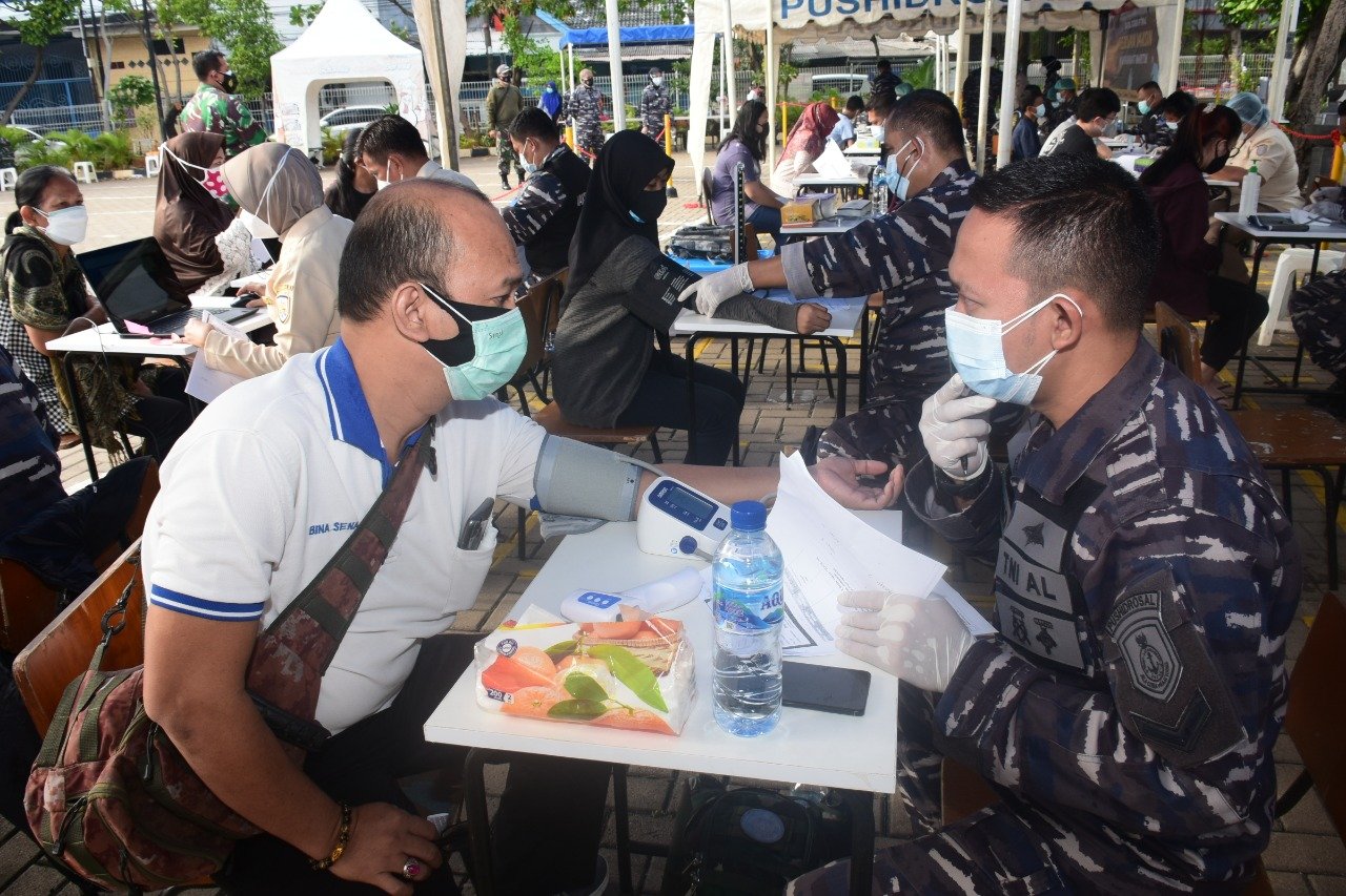 Tim Vaksinator Vaksin Massal Covid-19 TNI Angkatan Laut terus bergerak dalam rangka menyukseskan program pemerintah untuk dapat melaksanakan vaksinasi dengan target 1 juta sehari, yang bertujuan mencegah atau memutus mata rantai penyebaran Covid-19 di Indonesia.