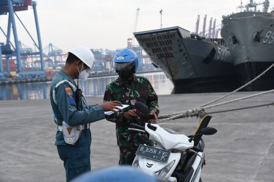 Satya Wira Jala Dharma. Operasi penegakan ketertiban (Gaktib) untuk prajurit dan PNS Komando Lintas Laut Militer (Kolinlamil) yang dilakukan oleh Polisi Militer Kolinlamil berlangsung secara mendadak di depan gerbang pintu masuk Mako Kolinlamil, Tanjung Priok, Jakarta Utara, Jumat (9/7/2021).