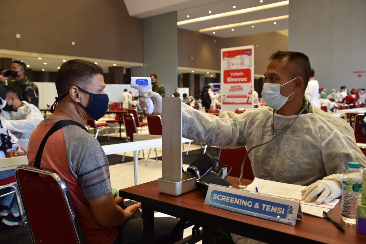 TNI AL melalui Pushidrosal mendukung Serbuan Vaksinasi Massal Covid-19 kembali digelar oleh Pusat Kesehatan (Puskes) TNI bekerja sama dengan WALUBI (Perwakilan Umat Budha Indonesia) di Kawasan JIEXPO Kemayoran, Jakarta Utara. Sabtu (14/8/2021)