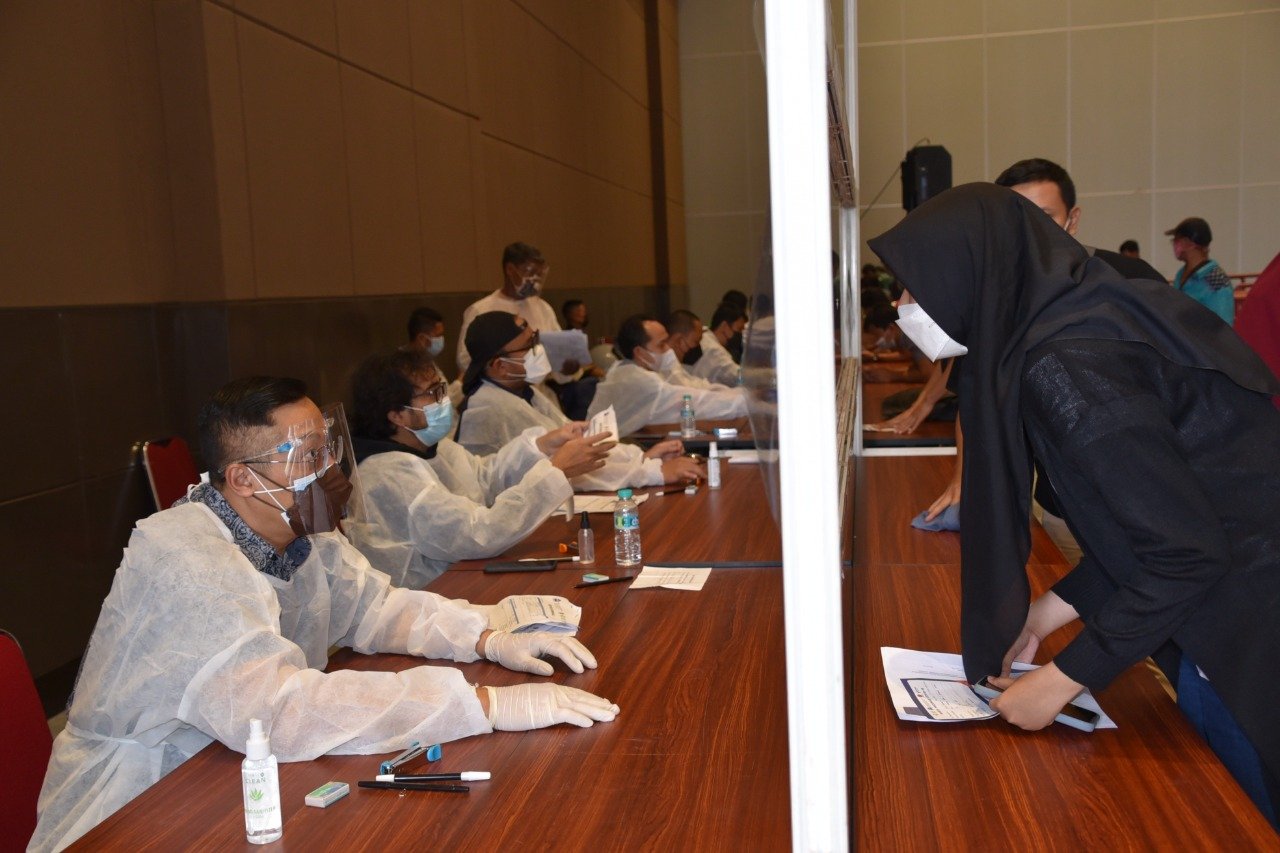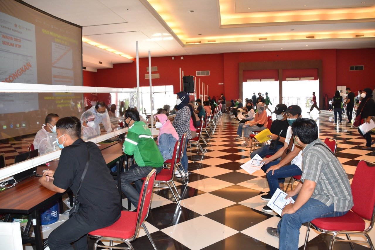 Beberapa sukarelawan juga membantu mengarahkan warga yang hadir untuk mengisi formulir pendaftaran dan dilakukkan pendataan satu persatu. Selanjutnya para peserta diarahkan masuk keruang tunggu di Hall C, menjalani screening kesehatan dan langsung dilakukan penyuntikan vaksin serra menerbitkan kartu vaksin.