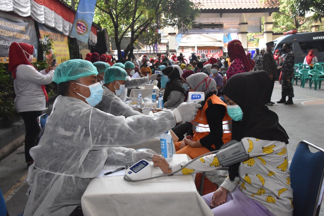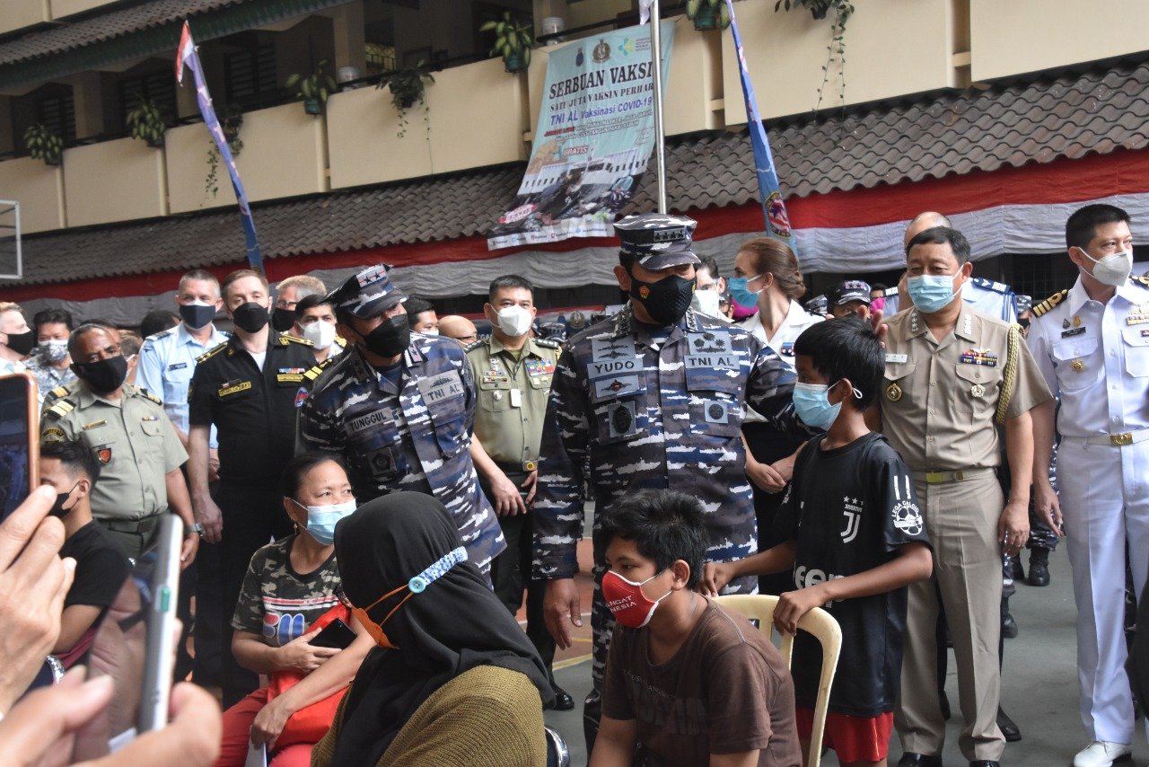 Dalam rangkaian kegiatan International Maritime Security Symposium (IMSS) Tahun 2021, TNI AL menggelar Vaksinasi massal Covid-19 dan memberikan bantuan sosial kepada masyarakat maritim di wilayah Kalibaru, Cilincing, Jakarta Utara, Rabu (18/8/2021)