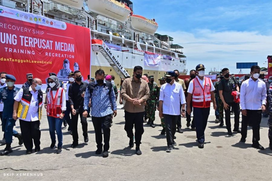 Menteri Perhubungan Budi Karya Sumadi meninjau pelayanan isolasi terpusat (isoter) terapung KM Bukit Raya, di Pelabuhan Belawan Medan, hari ini Sabtu (21/8/2021). Penyediaan kapal isoter ini merupakan bentuk dukungan Kemenhub bersama stakeholder terkait, dalam rangka mempercepat penanganan Covid-19 di Indonesia.