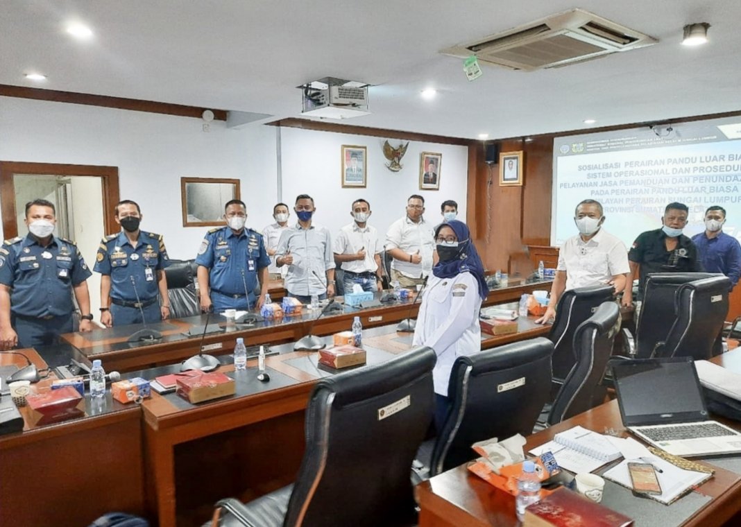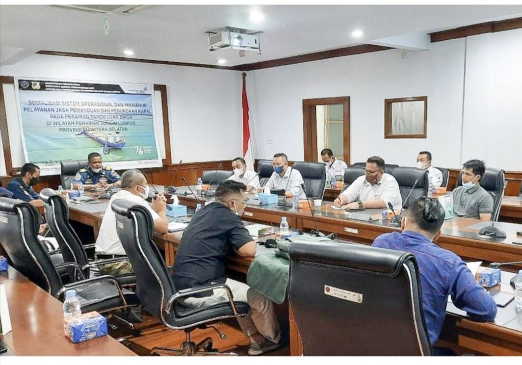 Kementerian Perhubungan Cq Direktorat Jenderal Perhubungan Laut melalui Kantor Unit Penyelenggara Pelabuhan (KUUP) Kelas III Sungai Lumpur menggelar sosialisasi Penetapan Perairan Pandu Luar Biasa (PPLB), Pelimpahan Pemanduan dan Penundaan Kapal, Sistem Prosedur Pelayanan Jasa Pemanduan dan Penundaan Kapal di wilayah kerja Sungai Lumpur – Sumatera Selatan, Jumat (27/8/2021).