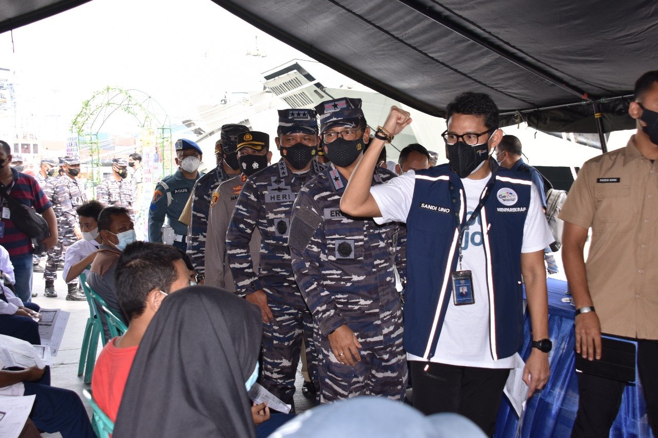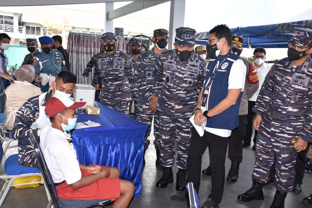 Menteri Parekraf Sandiaga Uno dengan pantunnya untuk mendukung vaksinasi bersama masyarakat dan TNI AL menuju Indonesia sehat dan maju mengungkapkan apresiasinya terhadap kegiatan serbuan vaksin maritim ini yang menyasar para pelajar sekolah usia 12 hingga 17 tahun.