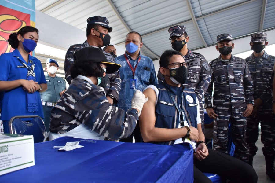 Saat akan menuju lokasi vaksin, Menteri Parekraf Sandiaga Uno didampingi Wakil Kepala Staf Angkatan Laut Laksdya TNI Ahmadi Heri Purwono dan Panglima Kolinlamil Laksma TNI Erwin S Aldedharma beriringan mengunjungi tenda-tenda vaksinasi.