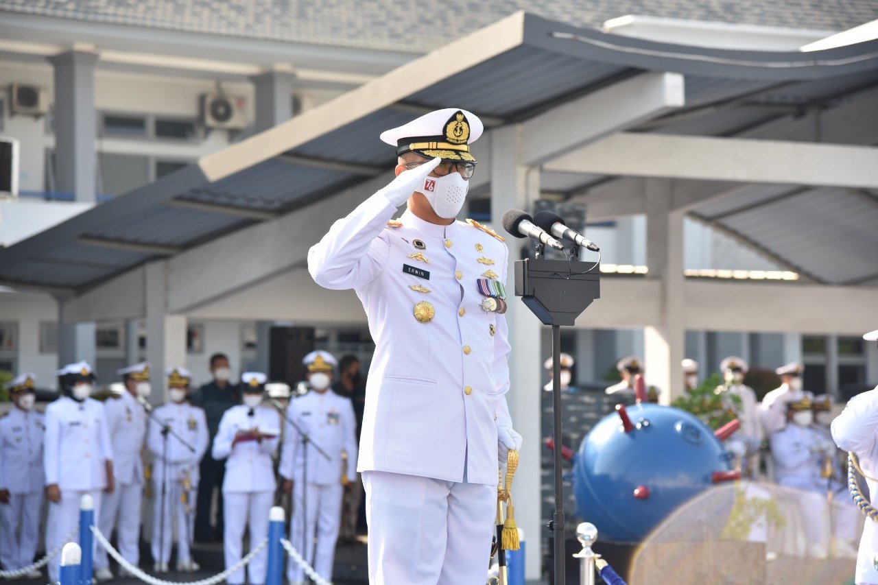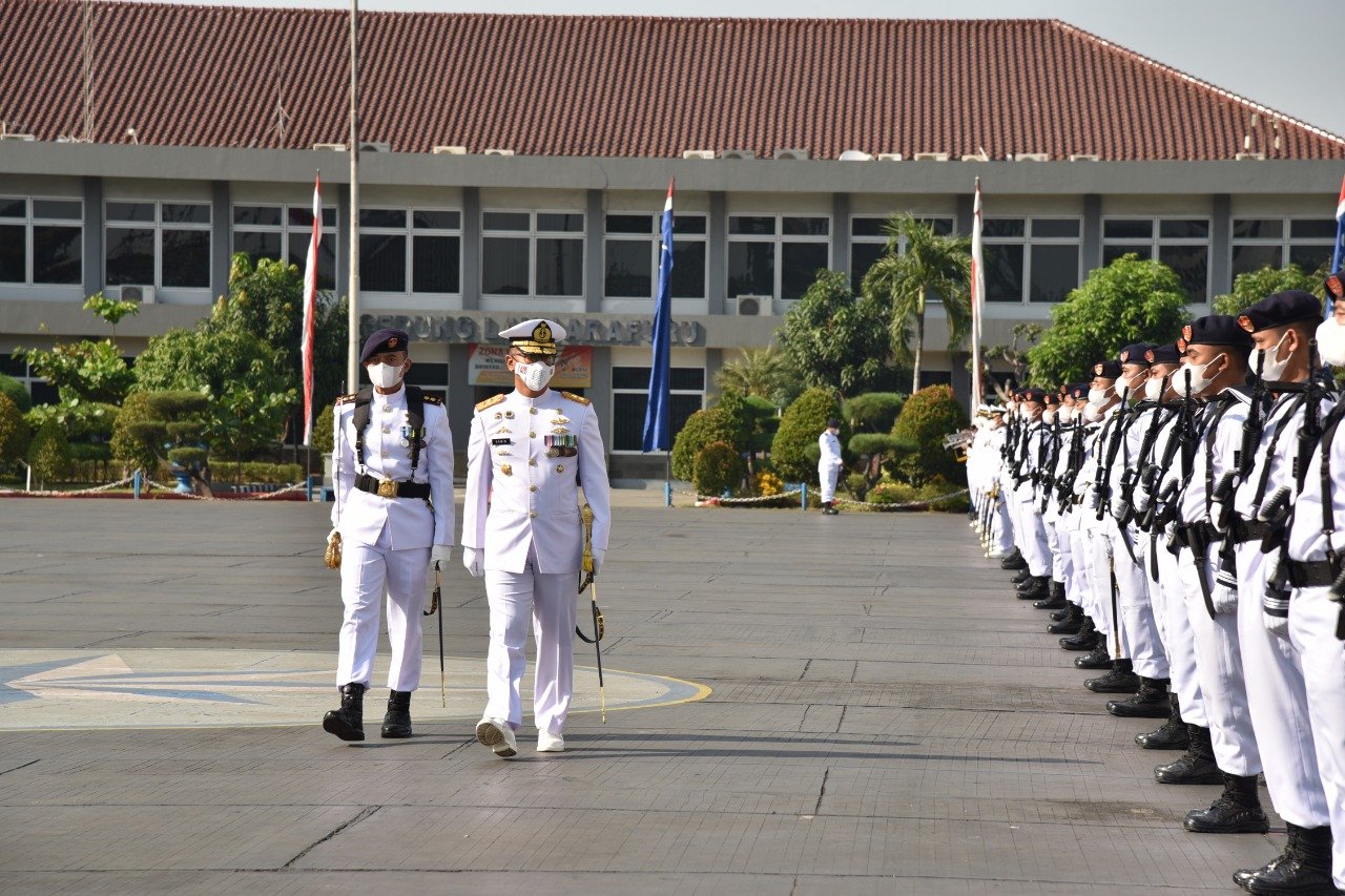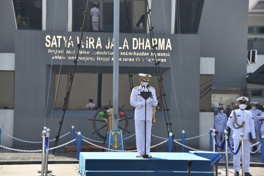 Satya Wira Jala Dharma. Panglima Komando Lintas Laut Militer (Kolinlamil) Laksda TNI Erwin S Aldedharma memimpin langsung upacara peringatan HUT Ke-76 TNI AL Tahun 2021, di Lapangan Mulyono Silam, Mako Kolinlamil – Jakarta Utara, Kamis (10/9/2021).