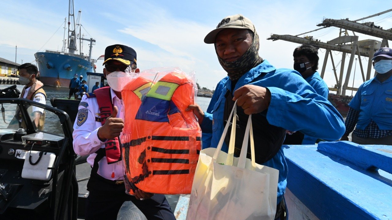 Jelang HARHUBNAS tahun 2921 Kementerian Perhubungan Cq Direktorat Jenderal Perhubungan Laut melalui Kantor Syahbandar Utama (KSU) Pelabuhan Tanjung Priok menggelar aksi sosial berupa pemberian 100 jaket pelampung dan paket sembako, kepada awak kapal taksi air di dermaga Arung Samudera atau lebih dikenal dermaga ARSA di Pelabuhan Tanjung Priok Hari ini Senin (13/9/2021).