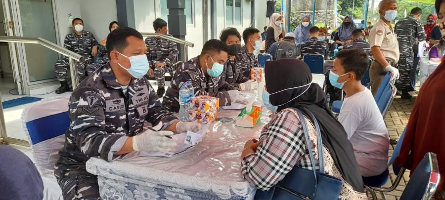TNI Angkatan Laut dalam hal ini Pusat Hidro-Oseanografi TNI Angkatan Laut (Pushidrosal) terus berlanjut menggelar serbuan vaksinasi di Desa Pasir Angin, Cileungsi Kabupaten Bogor. Rabu (15/9/2021).