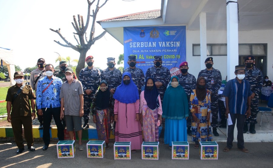 TNI Angkatan Laut menggelar menggelar Bakti Sosial (Baksos) berupa Serbuan Vaksinasi Covid-19 dan Pembagian paket sembako bagi masyarakat maritim Desa Tanjung Pasir, Tangerang Kabupaten Banten, hari ini Jumat (17/9/2021).