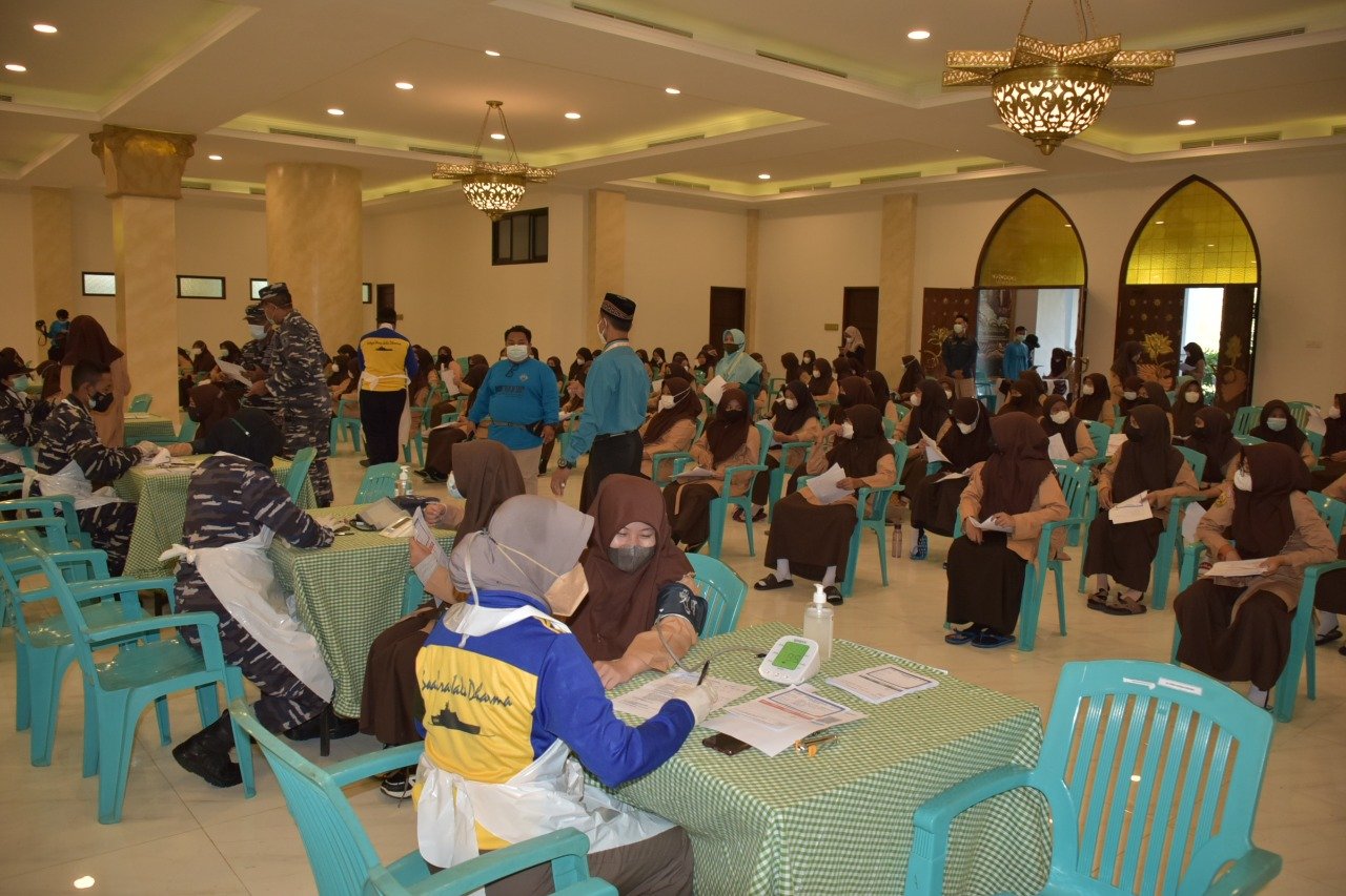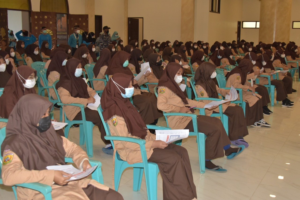 Satya Wira Jala Dharma. Sebanyak 1500 santri Pondok Pesantren Sahid, Pamijahan, Bogor menerima vaksinasi Covid-19 yang digelar Komando Lintas Laut Militer (Kolinlamil) TNI AL bekerjasama dengan Kecamatan Pamijahan Pemda Kota Bogor. Kamis (23/9/2021).