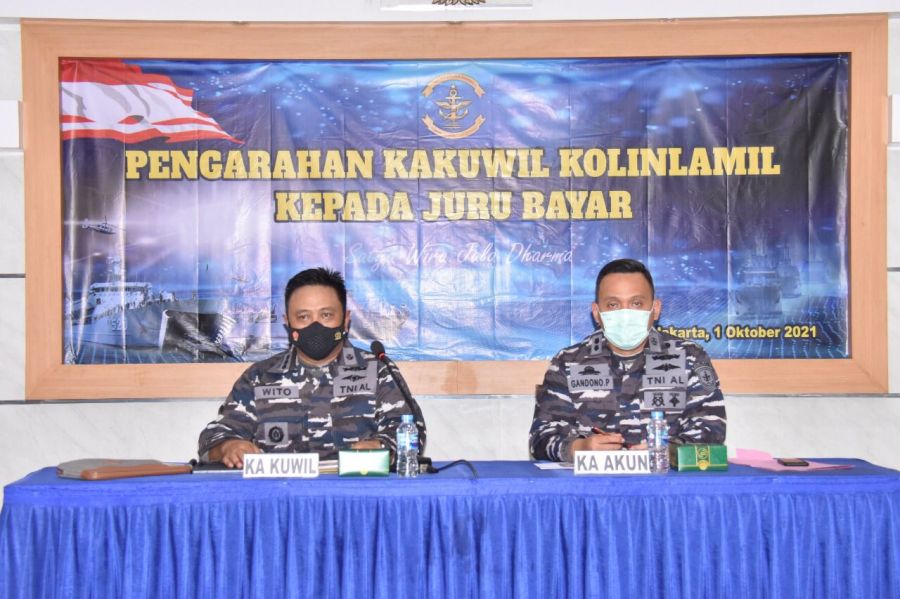 Satya Wira Jala Dharma Sebanyak 30 personel juru bayar dari masing – masing Satuan Kerja (Satker) jajaran Komando Lintas Laut Militer (Kolinlamil) TNI AL mendapatka pengarahan dari Kepala Keuangan Wilayah (Kakuwil) Kolinalmil Kolonel Laut (S) Wito Hadi Utomo bertempat di Gedung Laut Natuna Lantai 3, Jumat (1/10/2021)