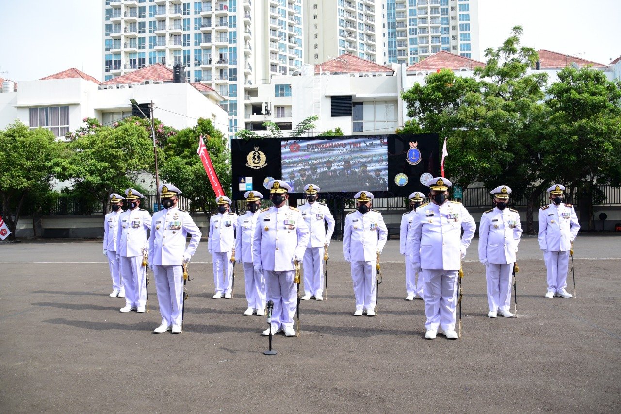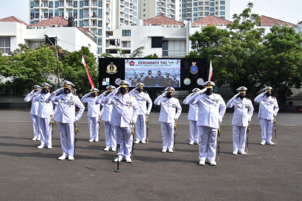 Wakil Komandan Pusat Hidro-Oseanografi TNI AL (Wadanpushidrosal) Laksamana Muda TNI Budi Purwanto, S.T., M.M mewakili Danpushidrosal Laksamana Madya TNI Dr. Agung Prasetiawan, M.A.P., menghadiri Upacara peringatan HUT Ke-76 TNI Tahun 2021 secara Virtual yang dilaksanakan di Lapangan Apel Mako Pushidrosal, Jalan Pantai Kuta V/I, Ancol Timur, Jakarta Utara. Selasa (5/10/2021).