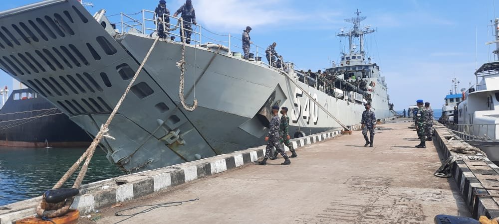 Kapal perang jenis Landing Ship Tank (LST) ini debarkasi batalion artileri pertahanan udara 16 Sula Bhuana Cakti. Para prajurit pun langsung tetap melakukan prosedur protokol kesehatan Covid – 19 dengan pemeriksaan suhu, disemprot disinfektan dan swab antigen.