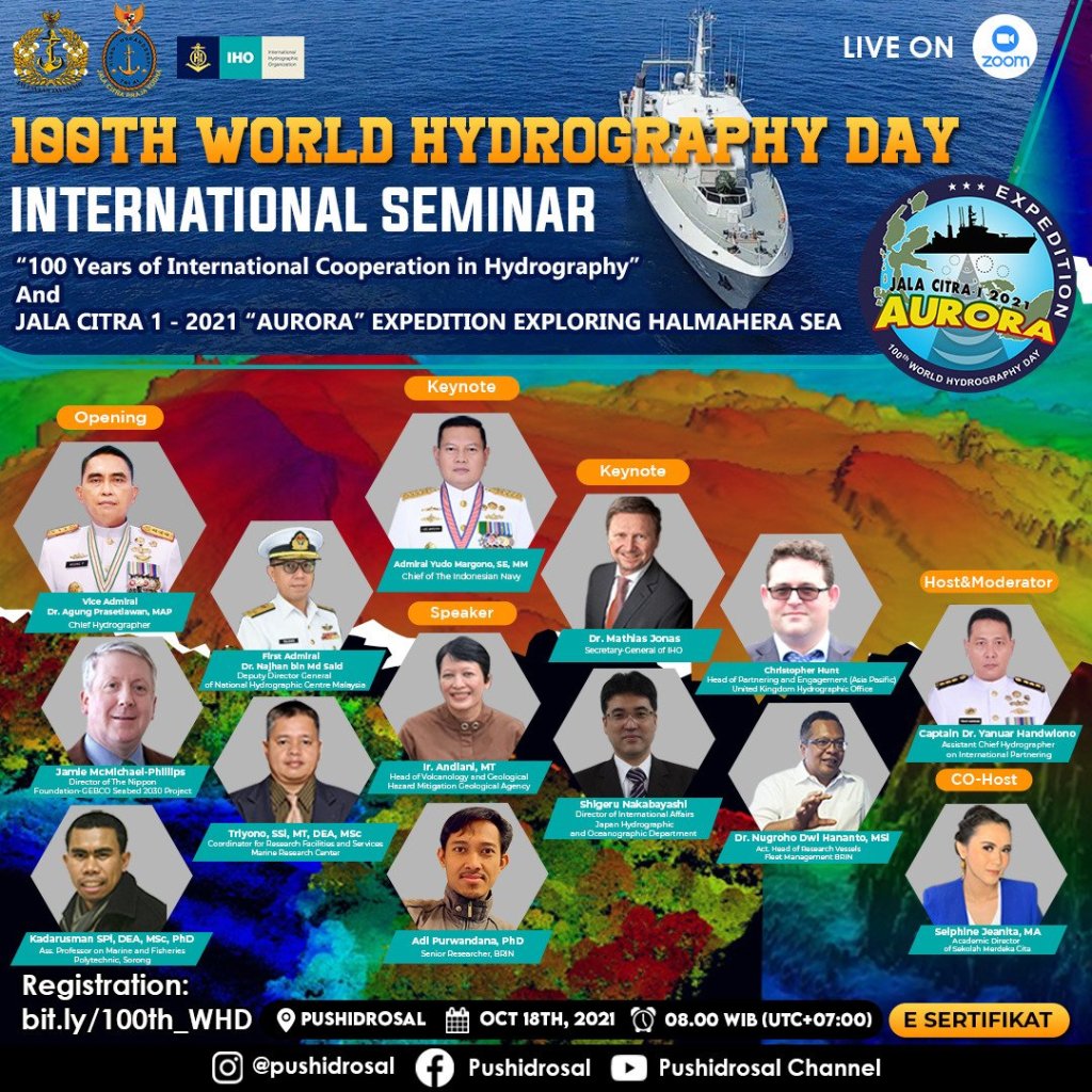 Sementara itu, Komandan Pushidrosal Laksamana Madya TNI Dr. Agung Prasetiawan, M.A.P dalam Opening Remark antara lain menyampaikan bahwa Kegiatan seminar dan Ekspedisi Jala citra 1 – Aurora merupakan salah satu wujud kontribusi aktif Pushidrosal sebagai lembaga hidrografi nasional dan bagian dari rangkaian kegiatan peringatan 100 tahun Hari Hidrografi Dunia 2021.