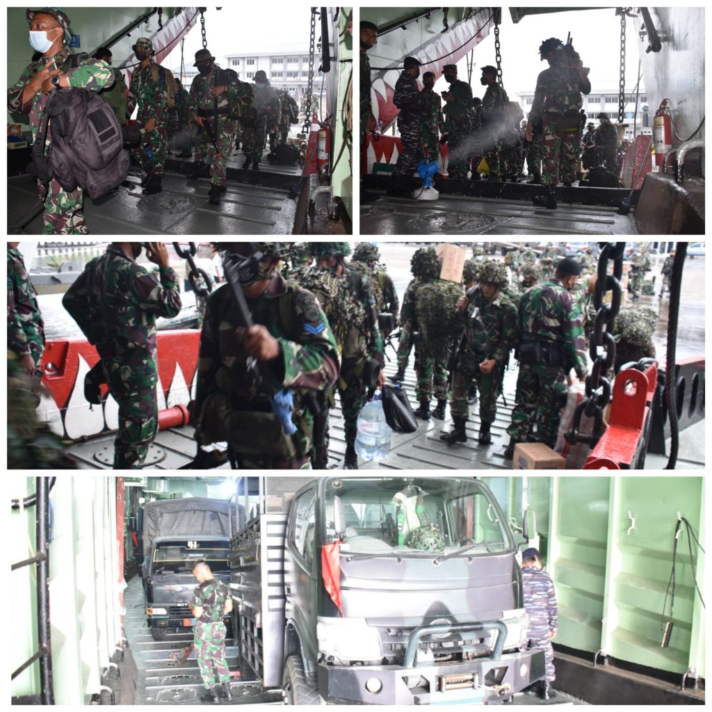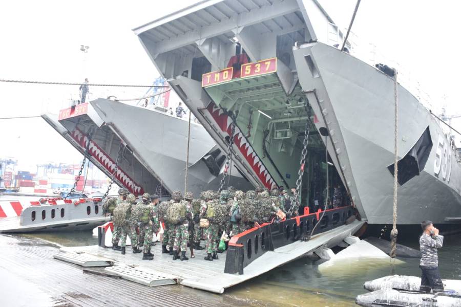 Beberapa KRI yang terlibat dalam latihan tersebut melaksanakan embarkasi pasukan dan kendaraan tempur di Dermaga Beaching Mako Kolinlamil, Tanjung Priok, Jakarta Utara, Kamis (21/10/2021).
