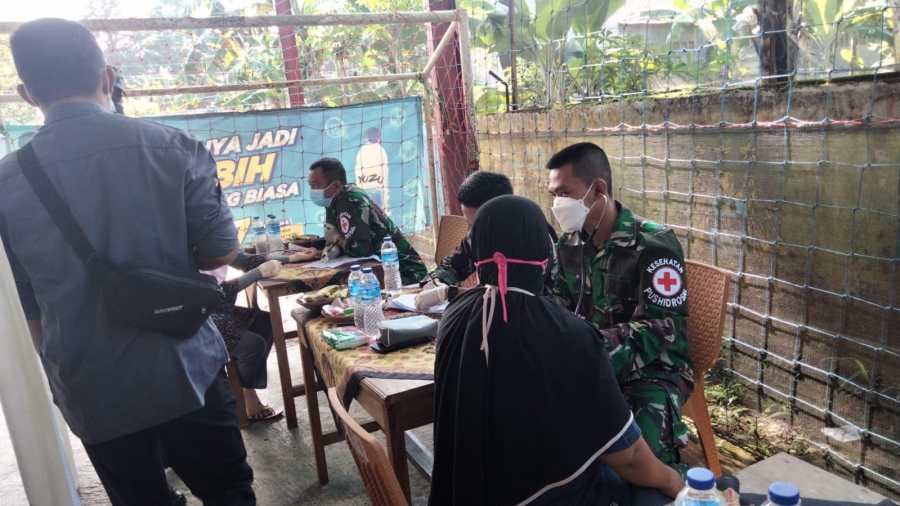 TNI AL dengan pelaksana lapangan Pusat Hidro-Oseanografi TNI Angkatan Laut (Pushidrosal), Batalyon Kesehatan Korps Marinir dan Diskesal ini mengerahkan 5 tenaga kesehatannya yang dibantu personel dari Puskesmas Situ Udik untuk melayani vaksinasi warga Cibatok Kecamatan Cibungbulang Kabupaten Bogor, Selasa (2/11/2021).