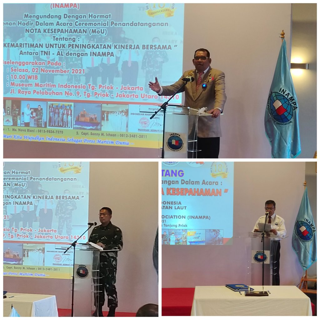 Ketua panitia penyelenggara penandatanganan kerjasama antara TNI AL dengan INAMPA Capt Agoes Suryanto S.H., M.H., saat mengawali acara menyampaikan laporan mengatakan bahwa setelah menyaksikan penandatanganan nota kesepahaman kerjasama TNI AL dengan INAMPA, semoga dengan penandatanganan peningkatan kerjasama kedepannya akan membawa manfaat bagi kedua belah pihak. Untuk melancarkan pelayanan di perairan pelabuhan dan pelayanan pemanduan kapal.