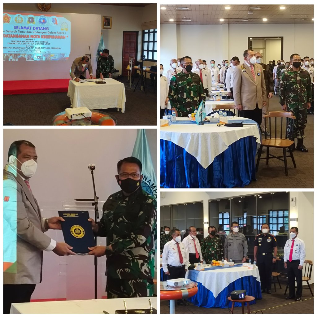 Bertempat di Museum Maritim Pelabuhan Tanjung Priok hari Selasa ( 2/11/2021) telah dilaksanakan acara penandatanganan Nota Kesepahaman (MoU) oleh Asisten Operasi (Asops) KASAL Laksamana Muda TNI Dadi Hartanto, M.Tr. (Han)., mewakili Kepala Staf TNI-AL (KASAL) dengn Presiden Indonesian Maritime Pilots’ Association (INAMPA) Pasoroan Herman Harianja. Dengan tema “Sinergitas Kemaritiman Untuk Peningkatan Kinerja Bersama.”
