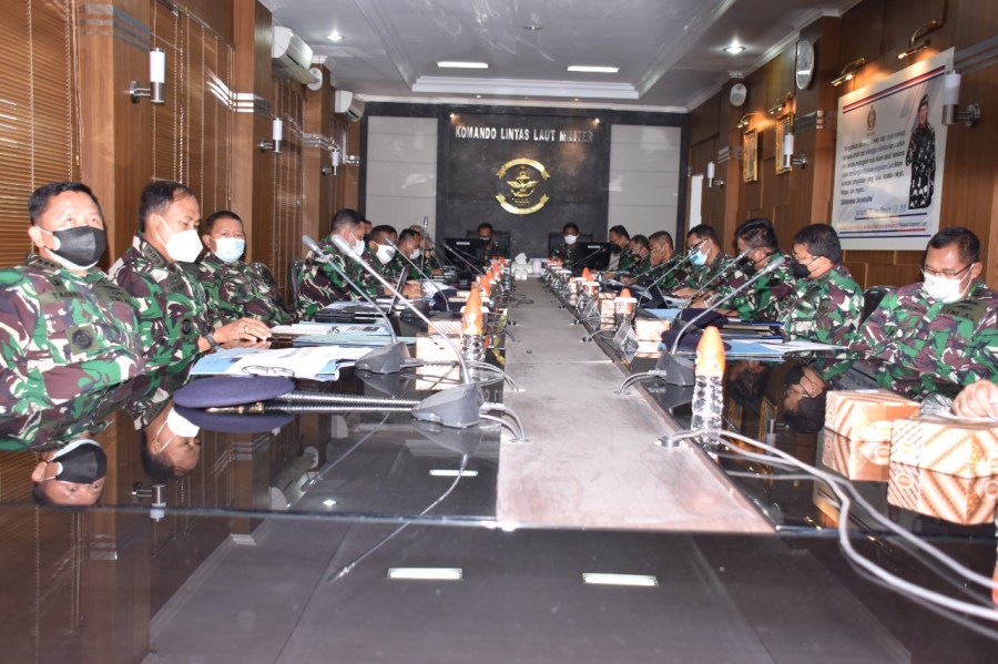 Satya Wira Jala Dharma. Panglima Komando Lintas Laut Militer (Kolinlamil) Laksda TNI Erwin S Aldedharma memimpin Rapat Rencana Kerja dan Anggaran Kementerian/Lembaga (RKA-KL) tahun 2023 dari Ruang Rapat Panglima, Mako Kolinlamil, Tanjung Priok, Jakarta Utara, Senin (1/11/2921) kemarin. RKA – KL kali ini melalui vicon untuk Satlinlamil 2 Surabaya dan Satlinlamil 3 Makassar.