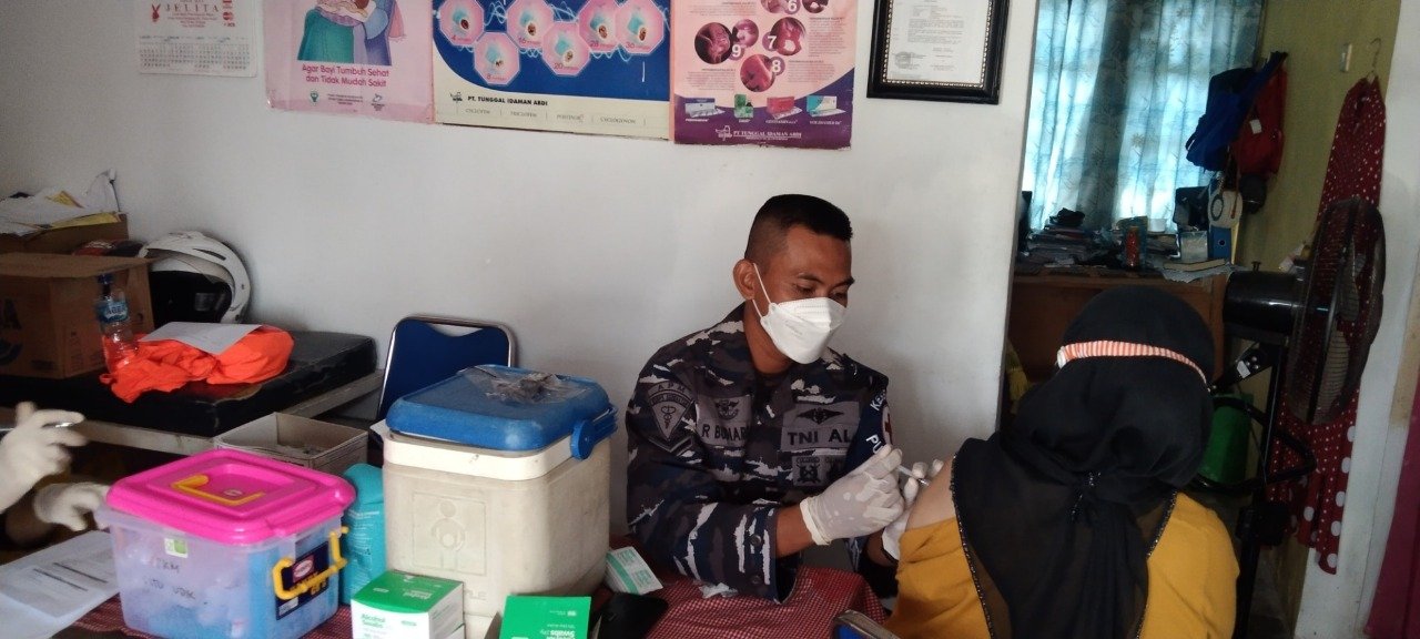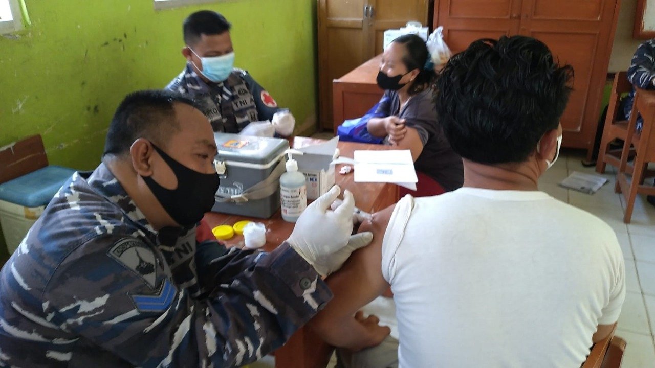 Tim kesehatan gabungan TNI AL yang terdiri dari personel Pusat Hidro-oseanografi TNI angkatan Laut (Pushidrosal), Batalyon Kesehatan Korps Marinir dan Diskesal ini melaksanakan vaksinasi bagi masyarakat yang dipusatkan di Puskesmas setempat maupun dari rumah ke rumah atau door to door.