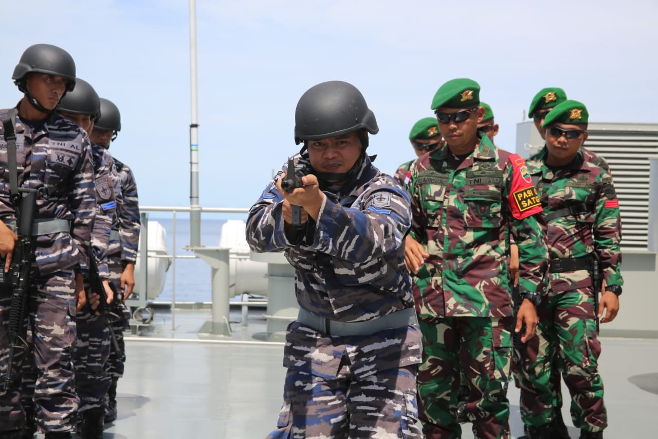 Mereka berlatih simulasi pelumpuhan perompak di lounge room dan latihan menembak di atas geladak KRI Banjarmasin 592.