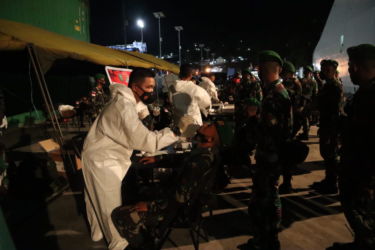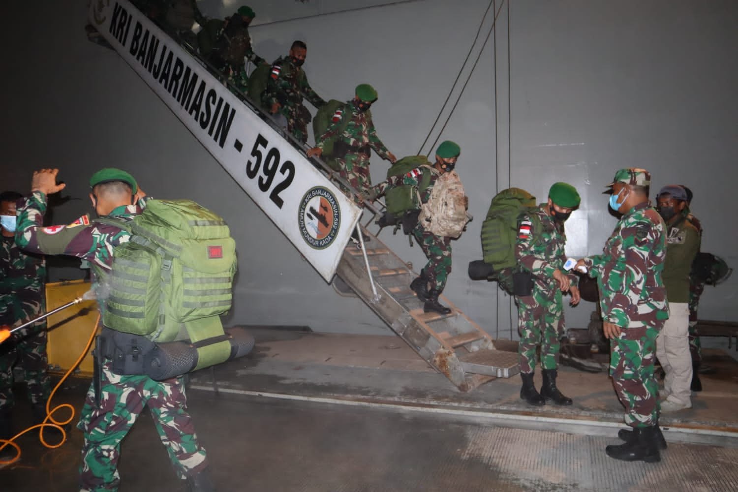 Komandan KRI Banjarmasin 592 menjelaskan debarkasi seluruh personil Satgas Pamtas RI-PNG itu dilakukan dengan mematuhi standar protokol kesehatan Covid-19 mulai dari pengecekan suhu badan personil TNI AD, hingga penyemprotan cairan disinfektan terhadap barang-barang bawaan para personil Satgas Pamtas RI-PNG.