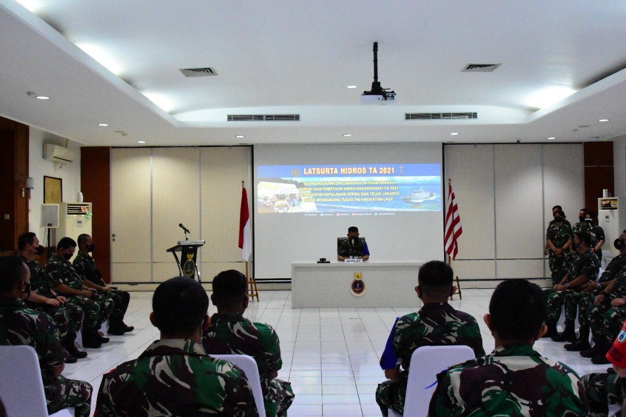 Komandan Pusat Hidro-Oseanografi TNI Angkatan Laut (Danpushidrosal) Laksamana Madya TNI Dr. Agung Prasetiawan, M.A.P membuka Geladi Posko Latihan Operasi Survei dan Pemetaan Hidro-Oseanografi (Latsurta Hidros) T.A 2021, di ruang Serbaguna Pushidrosal, Jalan Pantai Kuta V/I, Ancol Timur Jakarta Utara. Rabu (24/11/2021).