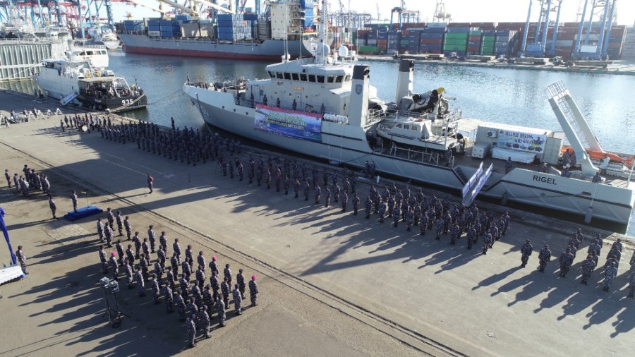 Komandan Pusat Hidro-Oseanografi TNI Angkatan Laut (Danpushidrosal) Laksamana Madya TNI Dr. Agung Prasetiawan, M.A.P. melepas manuvra lapangan(Manlap) Latihan Survei dan pemetaan (Latsurta) Hidro-Oseanografi TA 2021 di Dermaga Jakarta Internasional Container Terminal (JICT) 2, Tanjung Priok, Jakarta Utara, Kamis (2/12/2021).