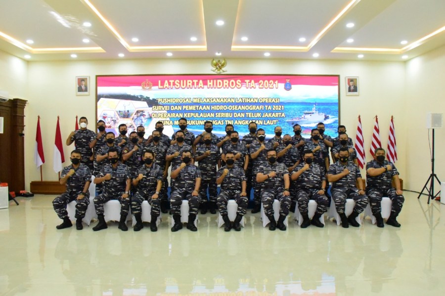 Komandan Pusat Hidro-Oseanografi TNI Angkatan Laut (Danpushidrosal) Laksamana Madya TNI Dr. Agung Prasetiawan, M.A.P., menutup Latihan Survei dan Pemetaan (Latsurta) Hidro-Oseanografi TA 2021 di Ruang Serba Guna Pushidrosal, Jl. Pantai Kuta V/I. Ancol Timur, Jakarta Utara. Jum’at (10/12/2021).