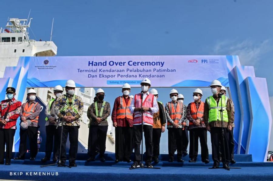 Menteri Perhubungan Budi Karya Sumadi hadir langsung dalam acara penyerahan pengelolaan (hand over) Terminal Kendaraan Pelabuhan Patimban dan ekspor perdana kendaraan, di Pelabuhan Patimban, Subang, Jawa Barat, Jumat (17/12/2021)