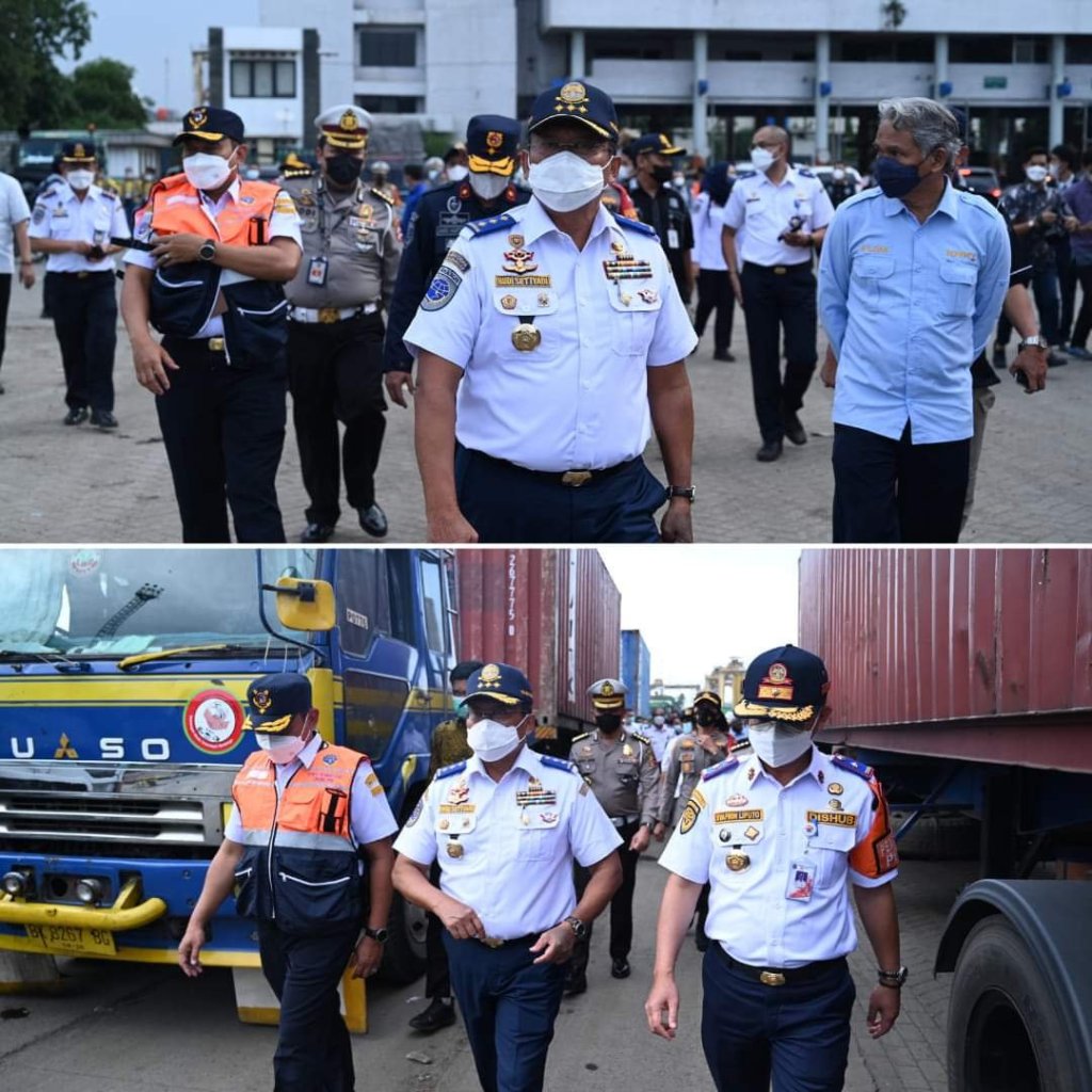 Kementerian Perhubungan Cq. Direktorat Jenderal Perhubungan Darat Budi Setiyadi melakukan Ramp Check sekaligus kampanye keselamatan pemasangan Alat Pemantul Cahaya (APC) bagi angkutan barang khususnya Truk Trailer di Pelabuhan Tanjung Priok, Jumat (17/12/2021).