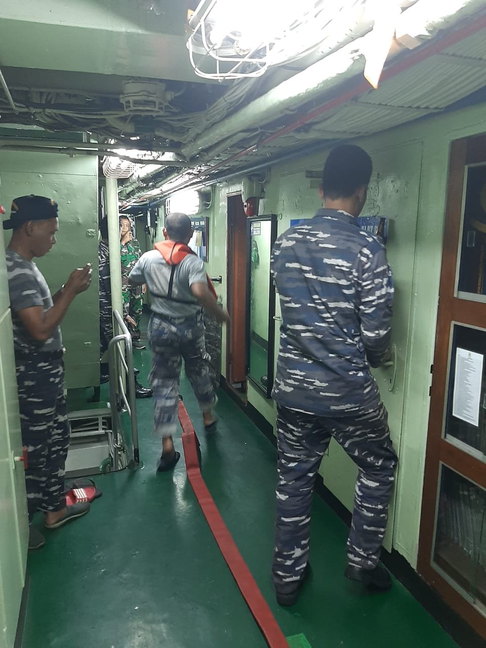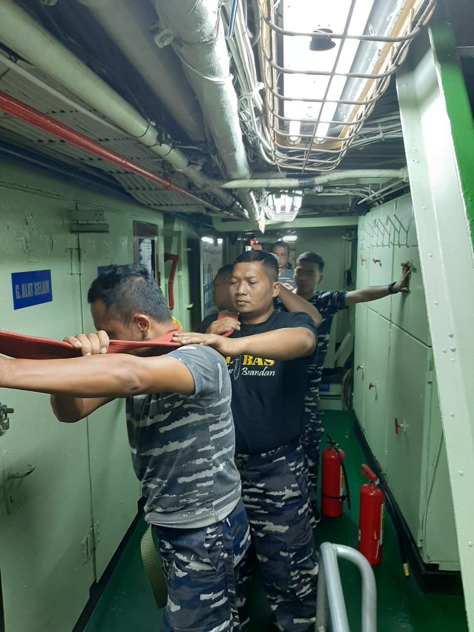 Untuk meningkatkan kewaspadaan dan profesionalitas, prajurit KRI Teluk Manado-537 yang masih terlibat dalam Latopsratmin 2021 melaksanakan latihan Peran Bahaya Kebocoran dan Kebakaran Kapal, Kamis (23/12/2021).
