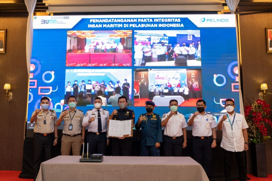 Sementara itu, Pakta Integritas yang salah satu isinya berbunyi “Berjanji akan melaksanakan tugas secara bersih, transparan dan profesional dalam arti akan mengerahkan segala kemampuan dan sumber daya secara optimal untuk memberikan hasil kerja terbaik” ini ditandatangani oleh seluruh petugas internal Pelindo di Regional 4, yakni perwakilan pandu, planner kapal, operator radio, petugas kepil, crew kapal, planner terminal, operator QCC, operator RTG/RMGC, operator reach stacker dan lain-lain, serta operator forklift.