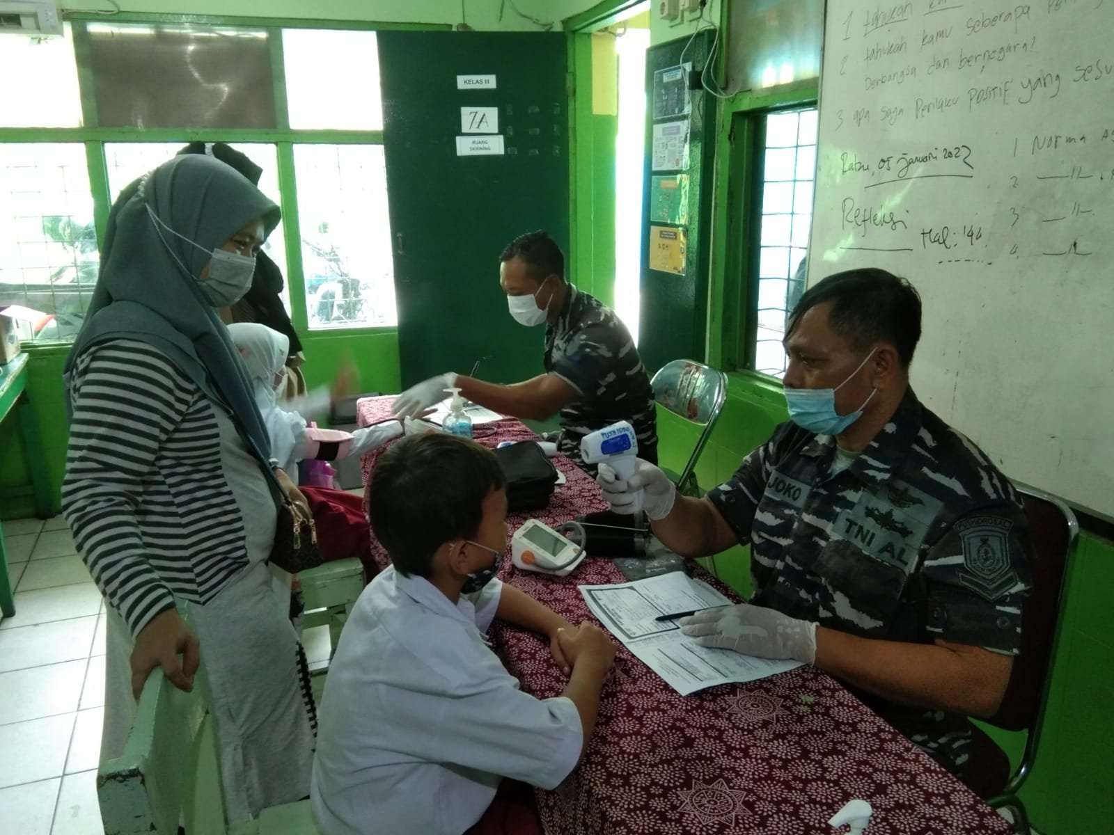 TNI-Polri bersinergi menggelar serbuan vaksinasi bagi masyarakat maritim dan para pelajar bertempat di Yayasan Pendidikan Putra Sejahtera, Kelurahan Pademangan Barat, Kecamatan Pademangan, Jakarta Utara Utara. Kamis (6/1/2022).