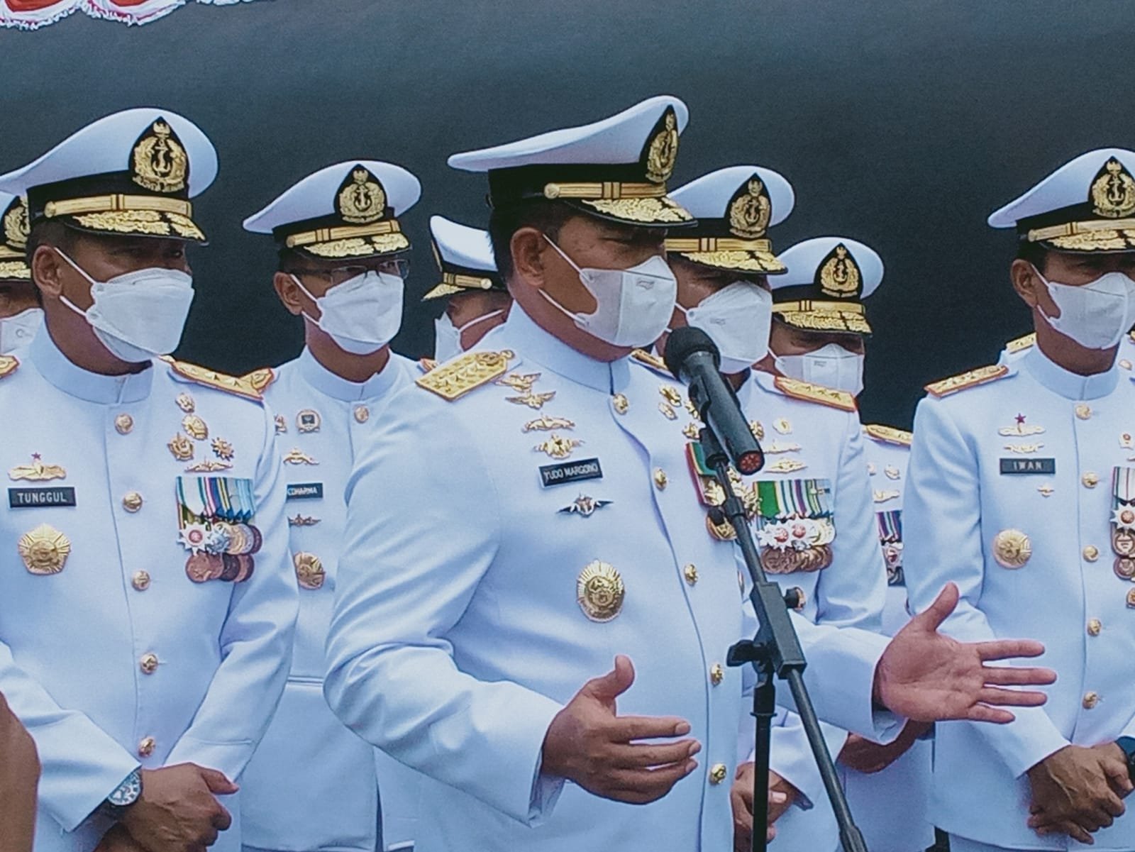 Panglima Komando Lintas Laut Militer Laksda TNI Erwin S Aldedharma mengikuti prosesi Upacara Tabur Bunga di laut dalam rangka peringatan Hari Dharma Samudera tahun 2022 di atas geladak KRI Wahidin Sudirohusodo-991, bertindak selaku Inspektur Upacara Kepala Staf Angkatan Laut Laksamana TNI Yudo Margono di Dermaga Madura Tengah, Koarmada II Surabaya, Sabtu (15/1/2022).