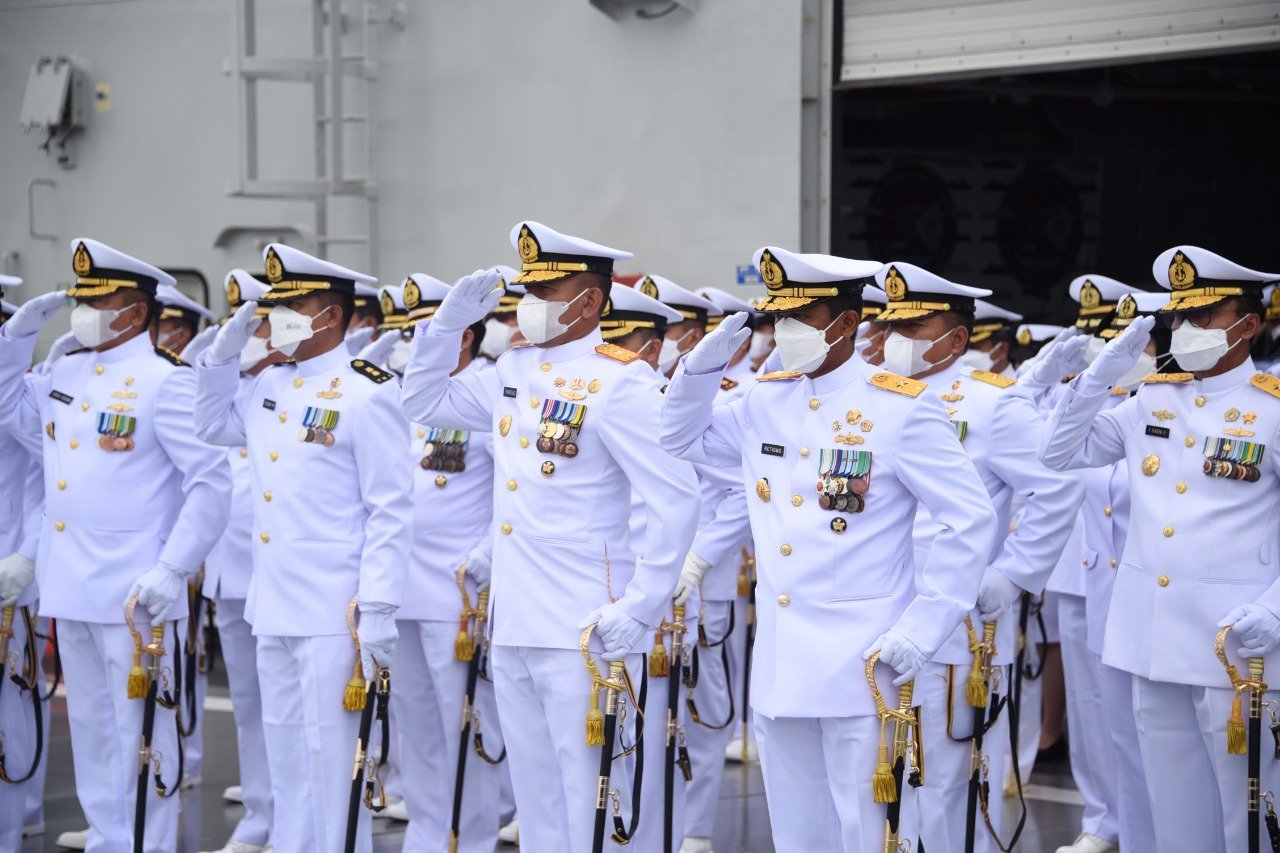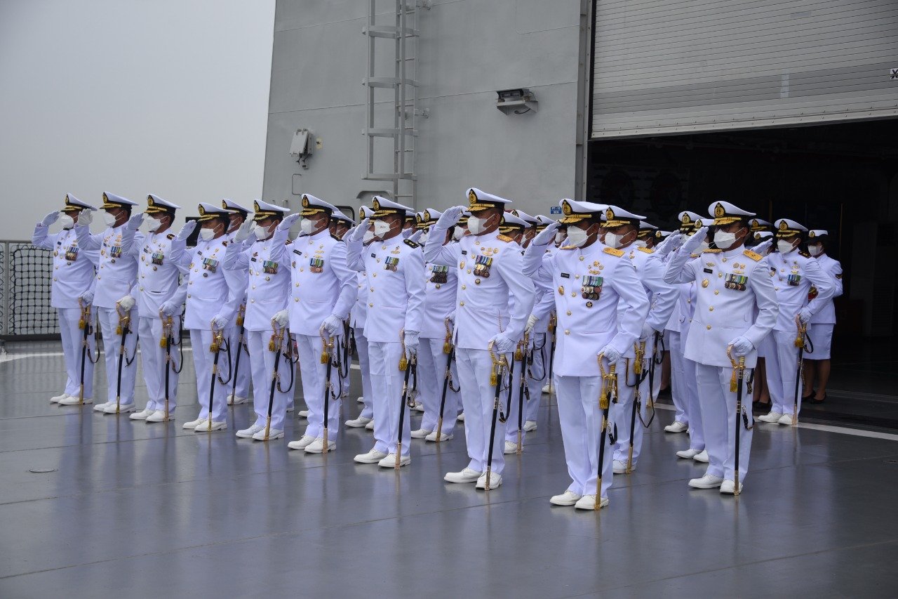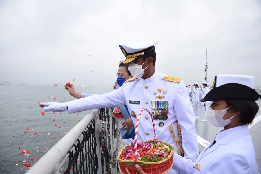 Kepala Staf Komando Lintas Laut Militer Laksma TNI Retiono Kunto mengikuti prosesi Upacara Tabur Bunga di Teluk Jakarta dalam rangka peringatan Hari Dharma Samudera di atas geladak KRI Semarang 594, bertindak selaku Inspektur Upacara Kepala Staf Komando Armada I Laksma TNI Eko Jokowiyono di Dermaga JICT 2, Tanjung Priok, Jakarta Utara, Sabtu (15/1/2022).