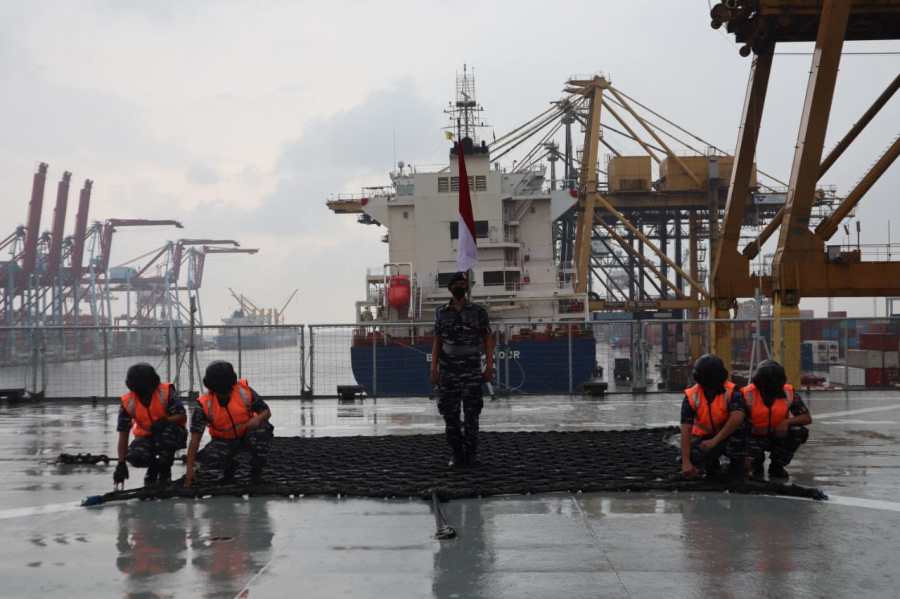 KRI Banjarmasin-592 melaksanakan uji Gladi Tugas Tempur Tingkat I (L-1) yang dilaksanakan di Dermaga Mako Kolinlamil, Tanjung Priok, Jakarta Utara, Rabu (19/1/2022).