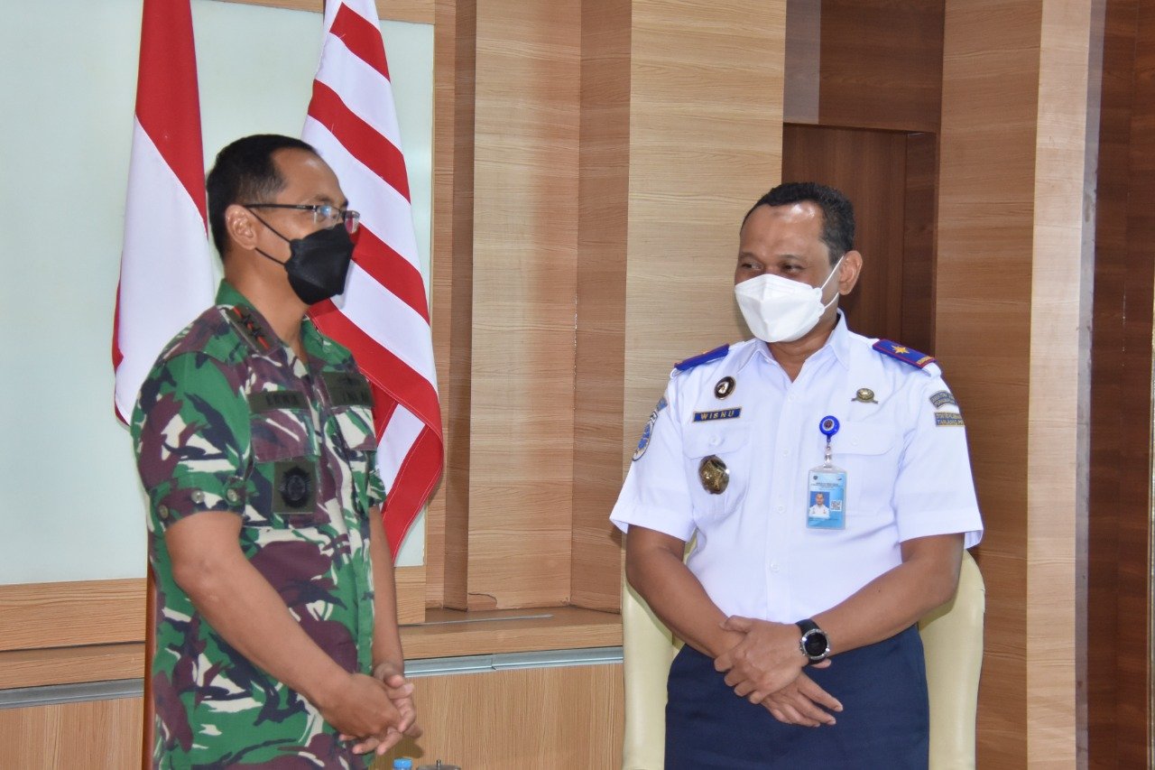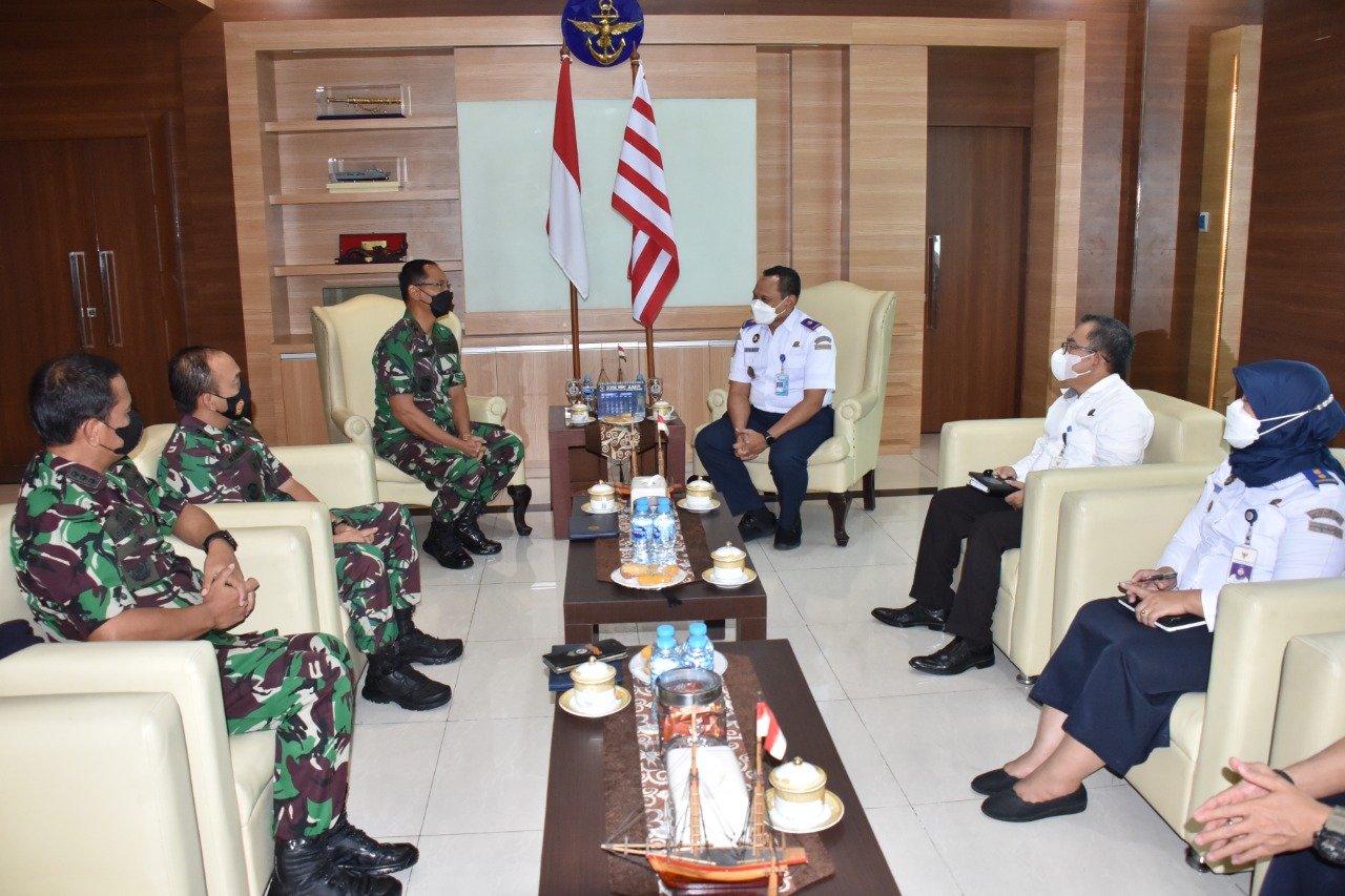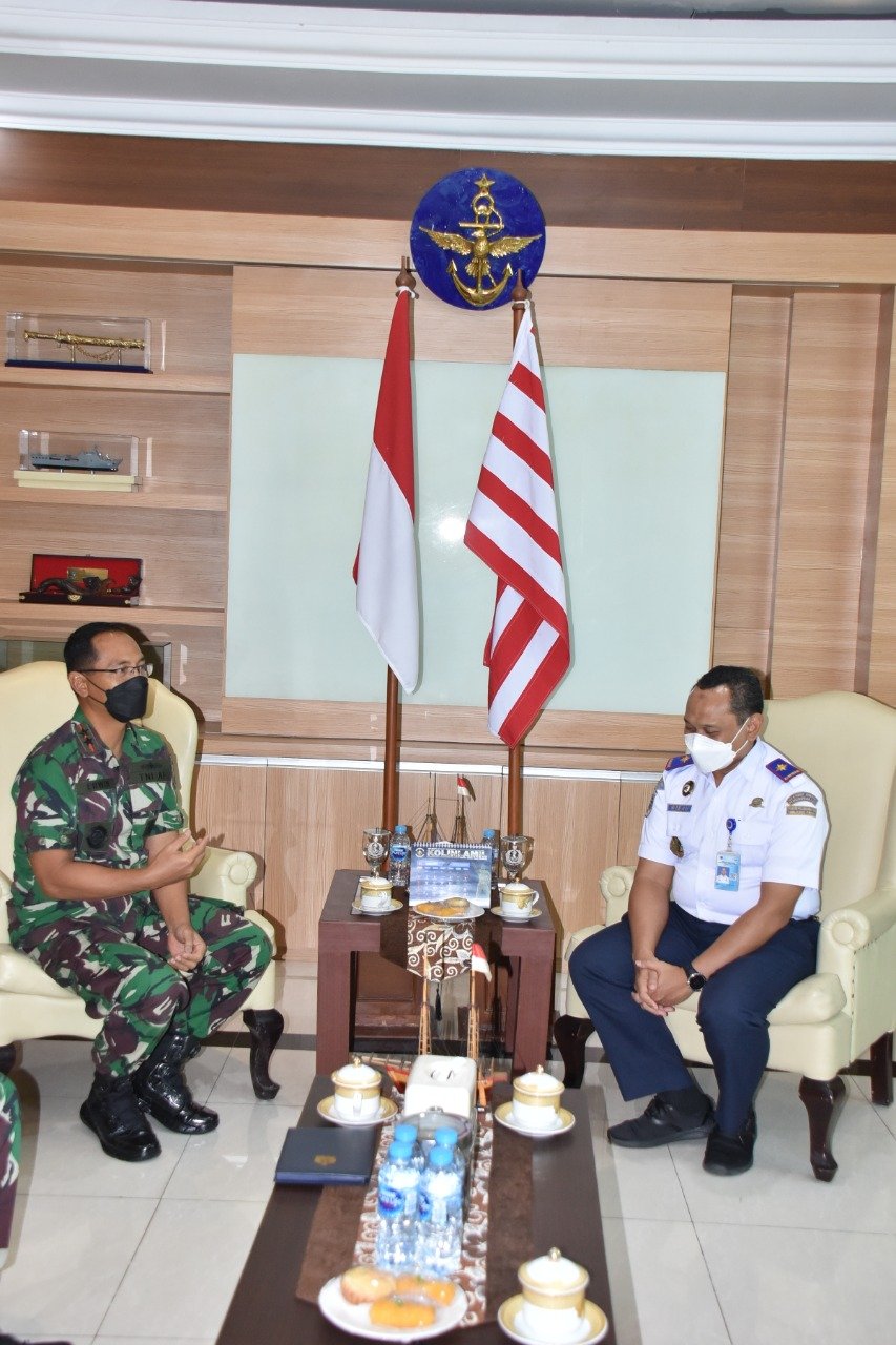 Panglima Komando Lintas Laut Militer Laksda TNI Erwin S Aldeharma menerima kunjungan kerja Kepala Kantor Otoritas Pelabuhan Utama Tanjung Priok Dr.Capt Wisnu Handoko,MSc di Mako Kolinlamil, Tanjung Priok Jakarta Utara, Rabu (19/1/2022).