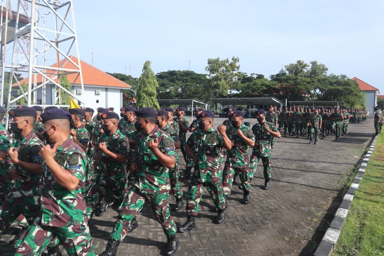 Satuan Lintas Laut Militer 2 menggelar latihan peraturan baris-berbaris (PBB) dan defile bagi seluruh prajurit dan PNS. Beragam latihan dan aba-aba baris-berbaris seperti saat pertama kali menjadi prajurit TNI AL pun ditampilkan dalam pelaksanaan kegiatan yang digelar usai apel gabungan Satlinlamil 2 yang berlangsung di Mako Satlinlamil 2, Surabaya, Senin (24/1/2022).