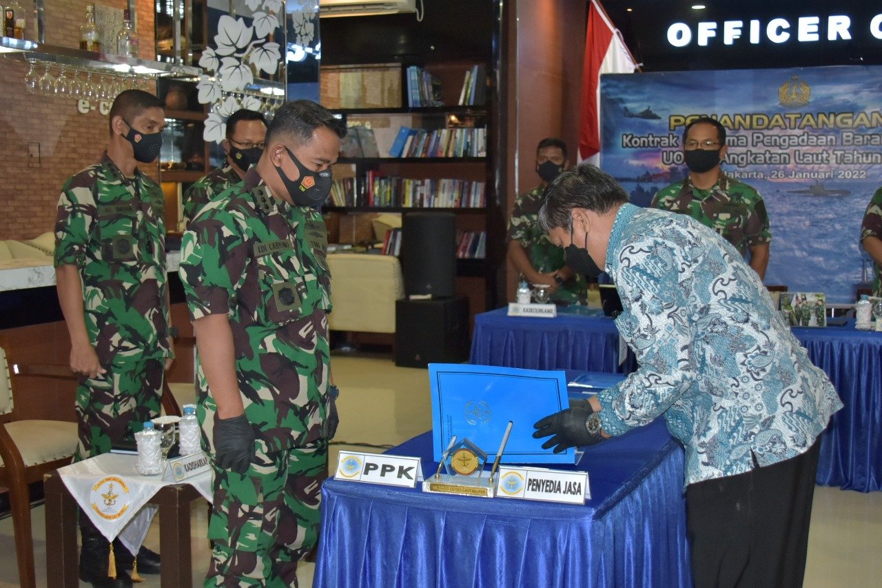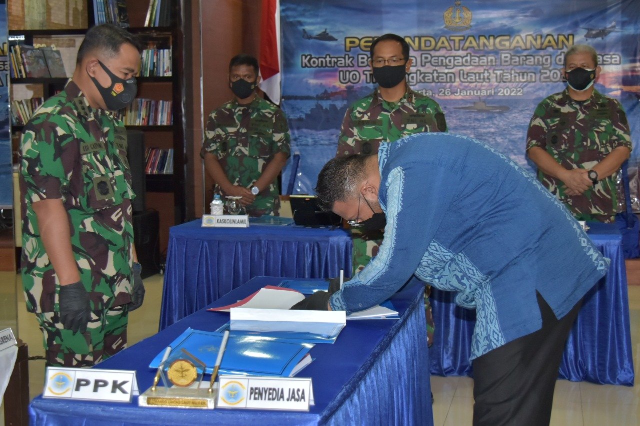 Penandatanganan kontrak secara kolektif antara para Pejabat Pembuat Komitmen (PPK) di lingkungan TNI AL dengan para mitra penyedia barang dan jasa ini disaksikan oleh Panglima Kolinlamil Laksda TNI Erwin S Aldedharma di Officer Club, Mako Kolinlamil, Jakarta Utara, Rabu (26/1/2022).